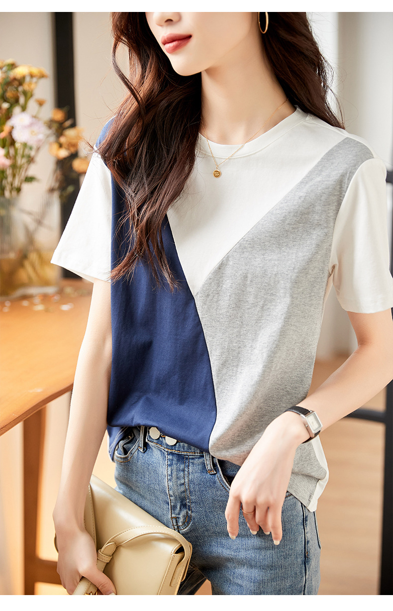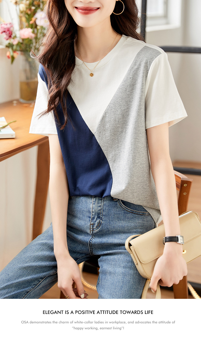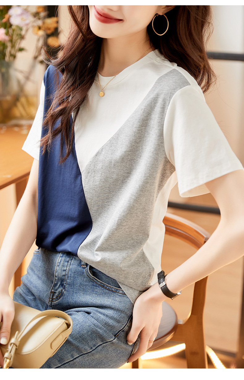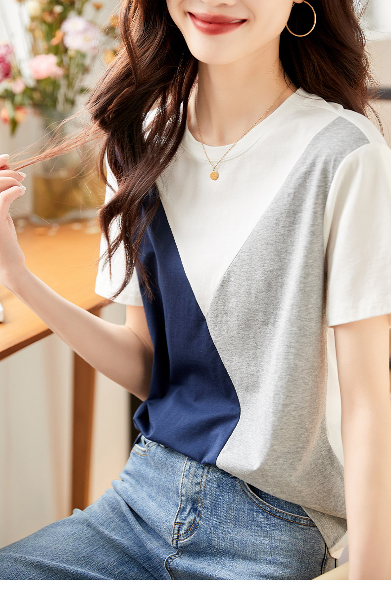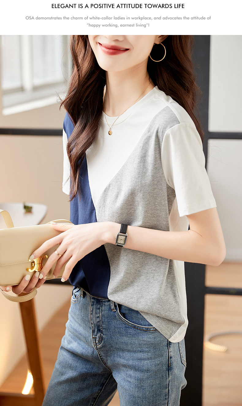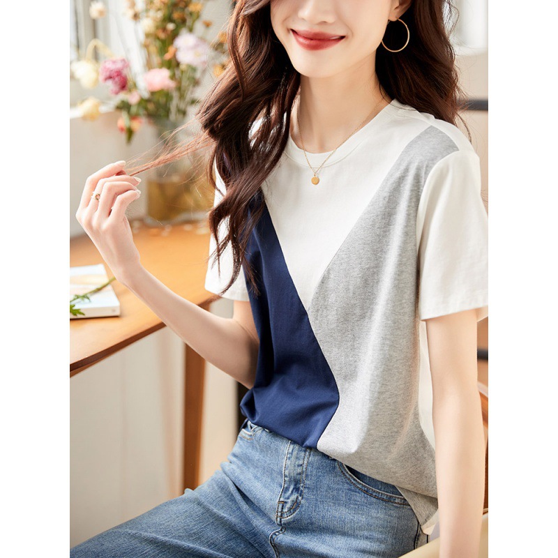 2022 여름 새로운 한국 스타일 편안한 패셔너블한 심플하고 우아한 착용 올매치 슬림핏 커버링 연령 감소 배색 여성 티셔츠스토어 가기