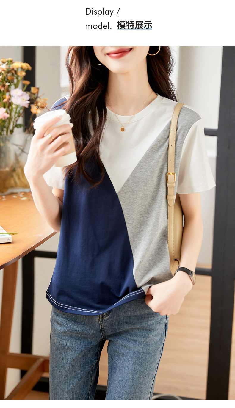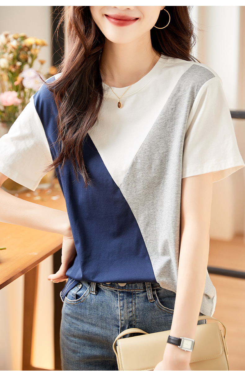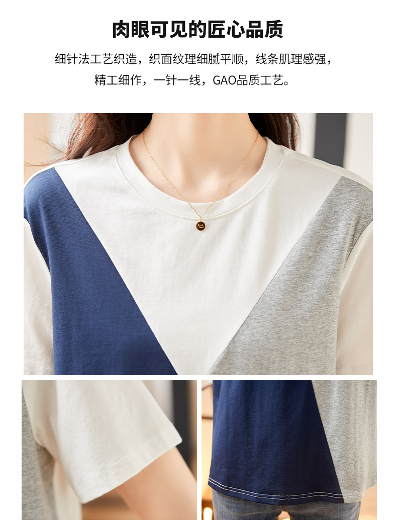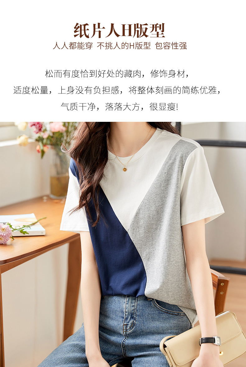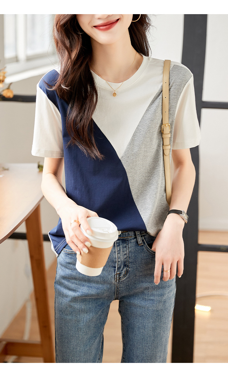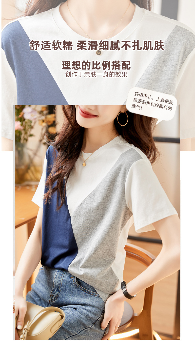 2022 여름 새로운 한국 스타일 편안한 패셔너블한 심플하고 우아한 착용 올매치 슬림핏 커버링 연령 감소 배색 여성 티셔츠스토어 가기