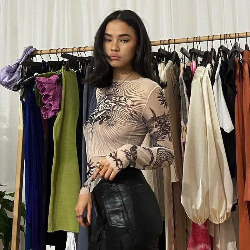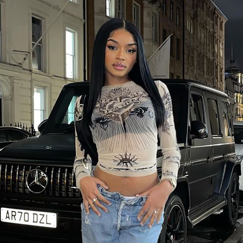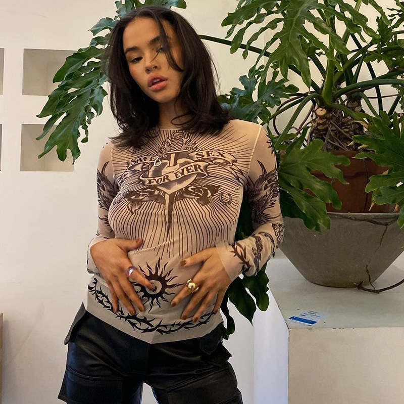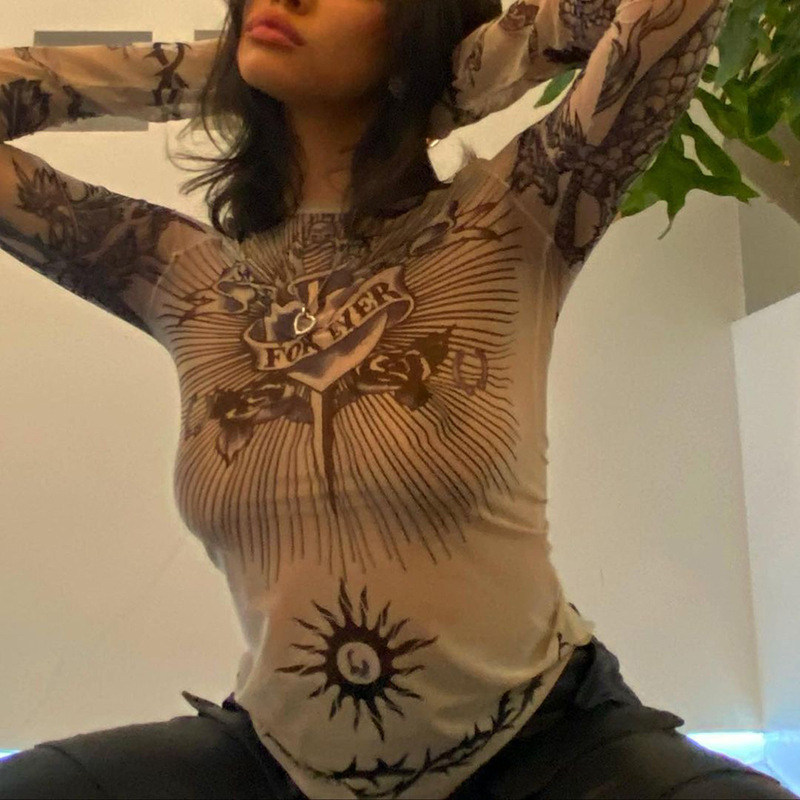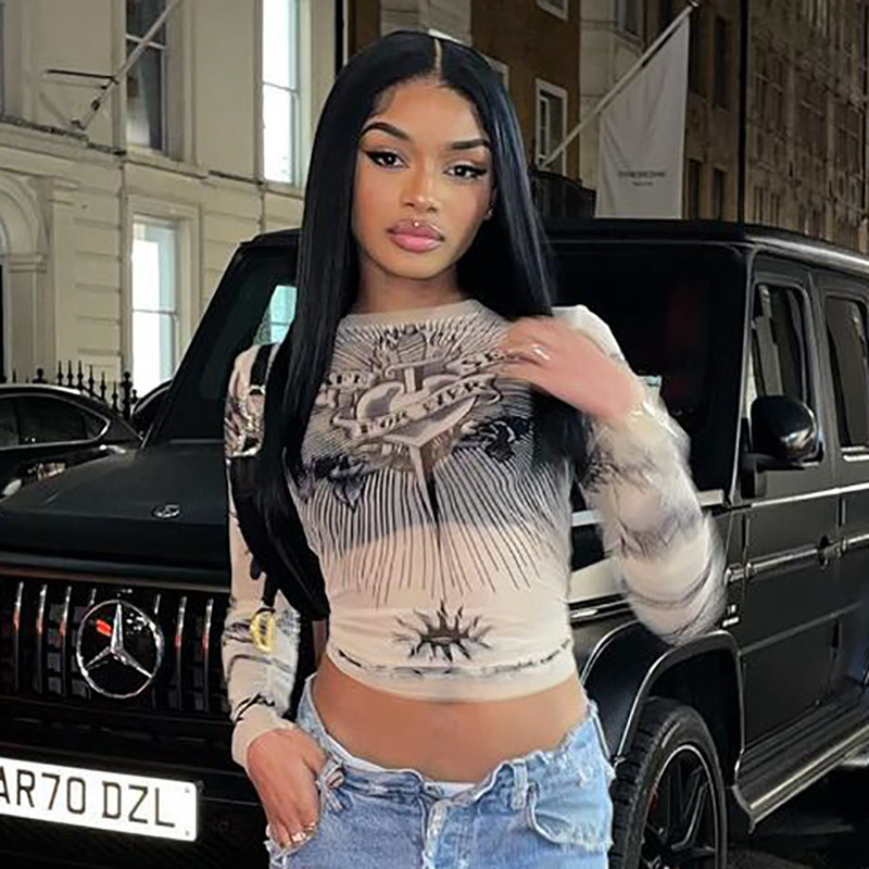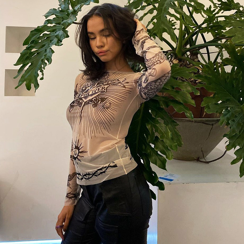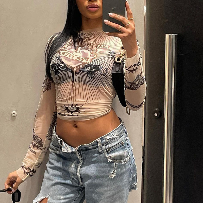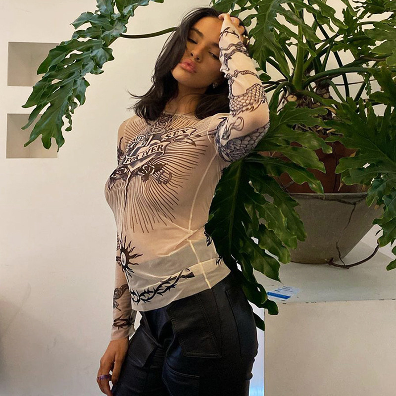 국경 2024 유럽과 미국의 가을 새로운 라운드 넥 긴 소매 풀오버 인쇄 마이크로 투명 패션 캐주얼 여성 최고 재고