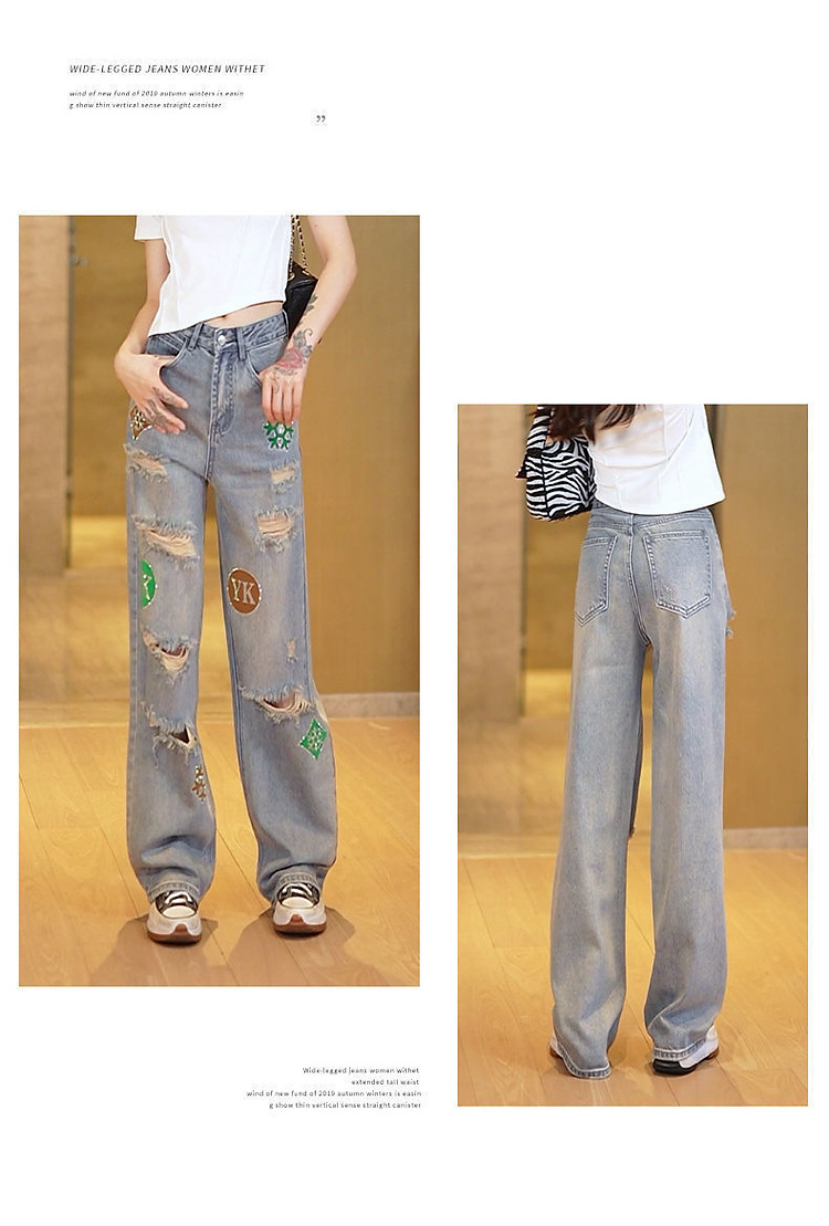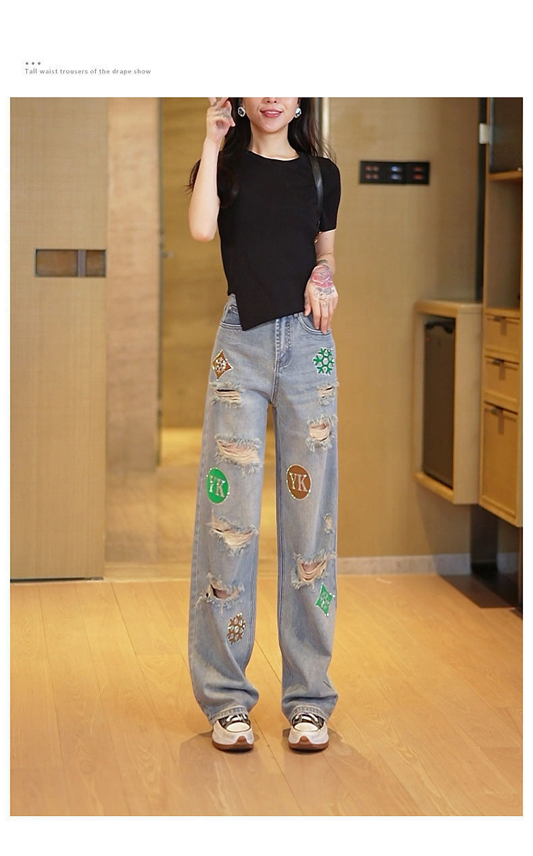 하이 웨이스트 찢어진 청바지 여성의 개인화 된 거지 패턴 핫 드릴링 여름 2023 새로운 느슨한 스트레이트 레트로 와이드 다리스토어 가기