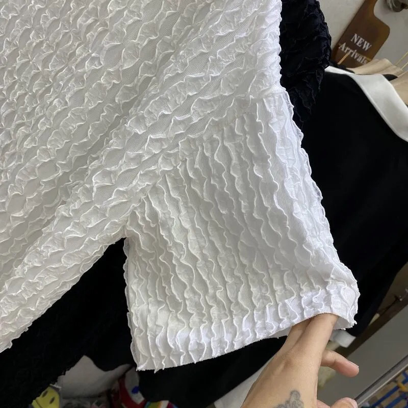 접힌 Auricularius 스티칭 쉬폰 셔츠 여성용 여름 느슨한 중간 길이 배꼽 덮음 2023 새로운 스플릿 반팔 티셔츠