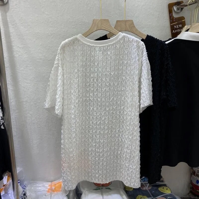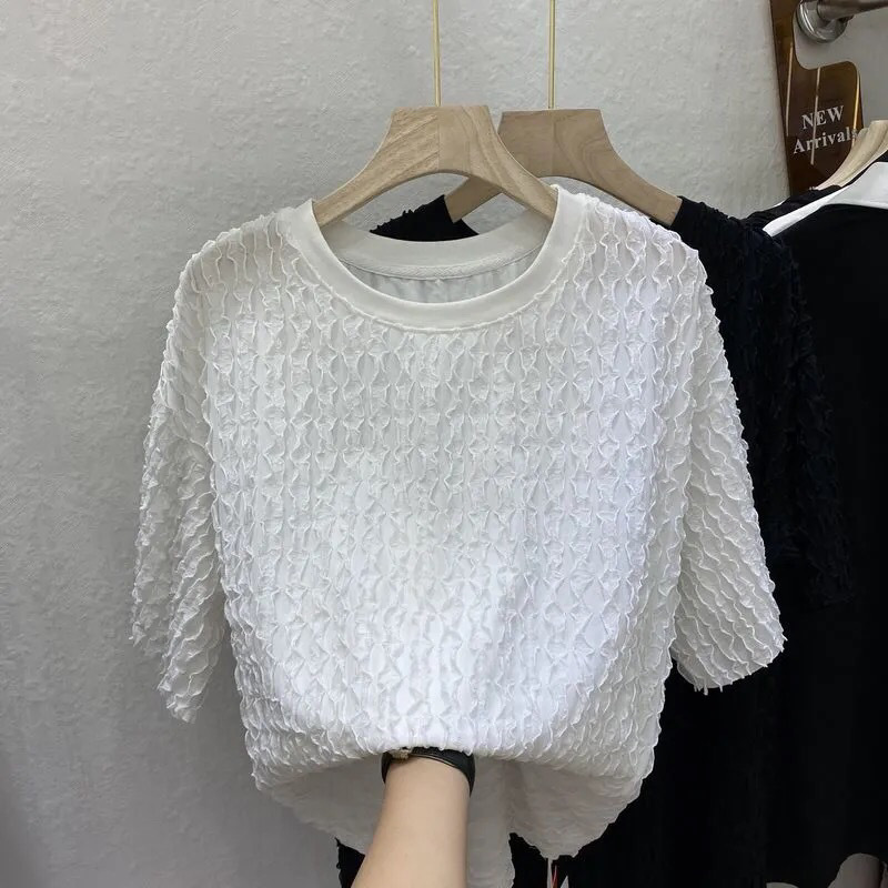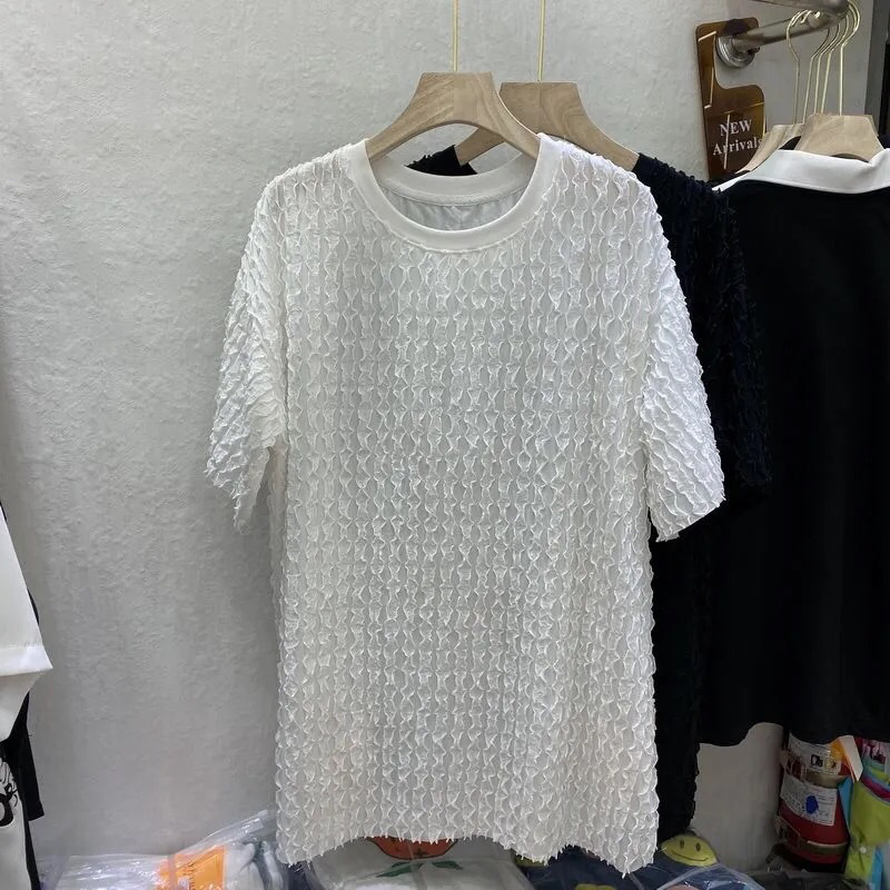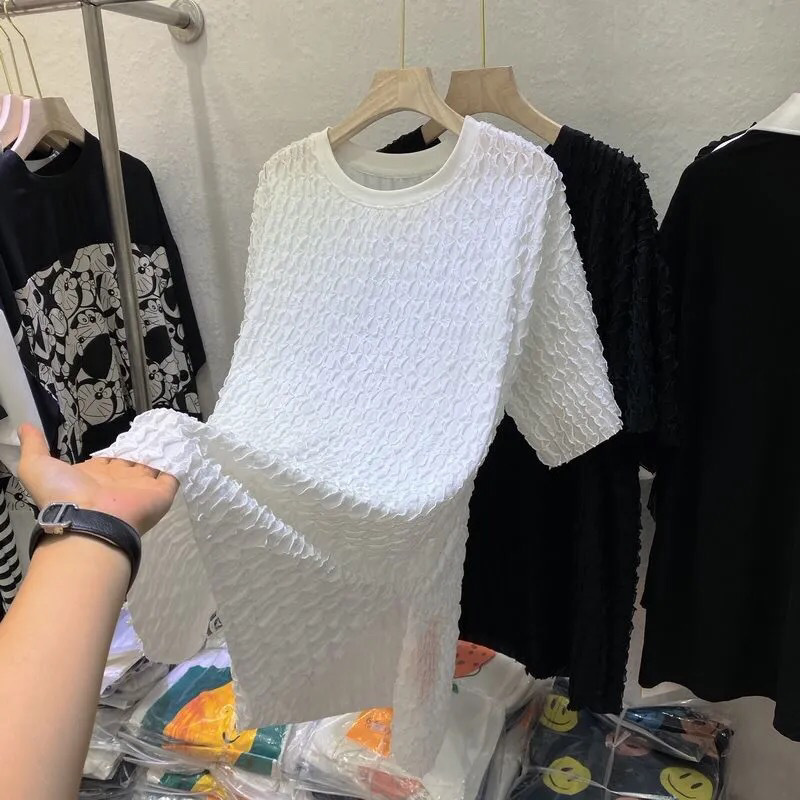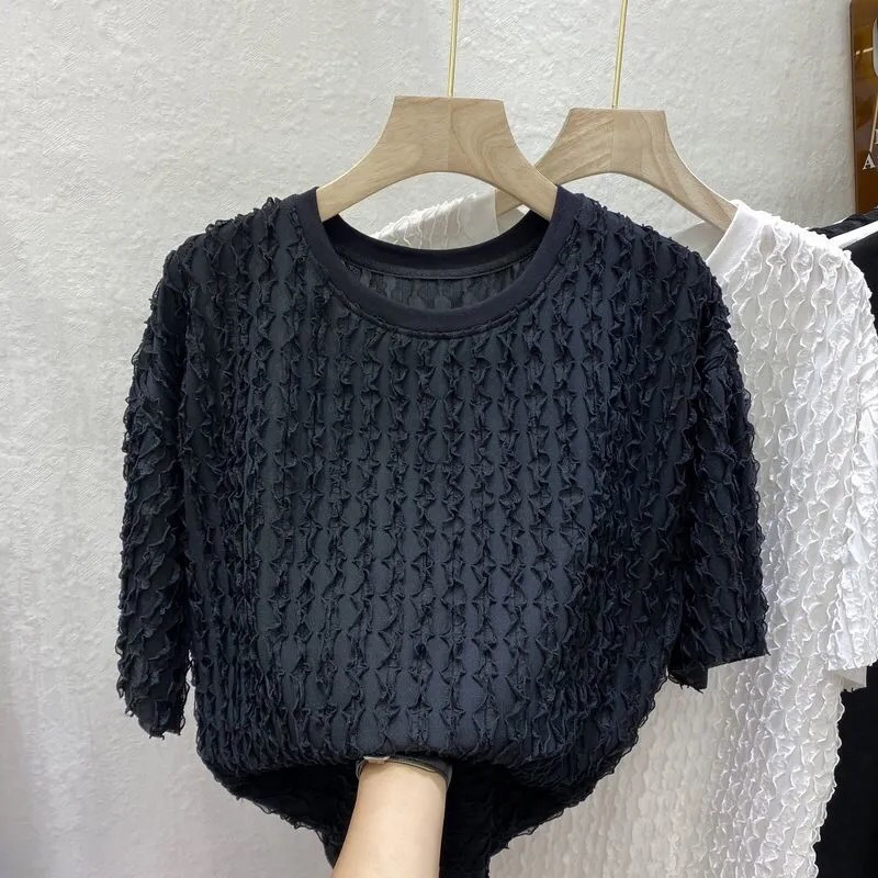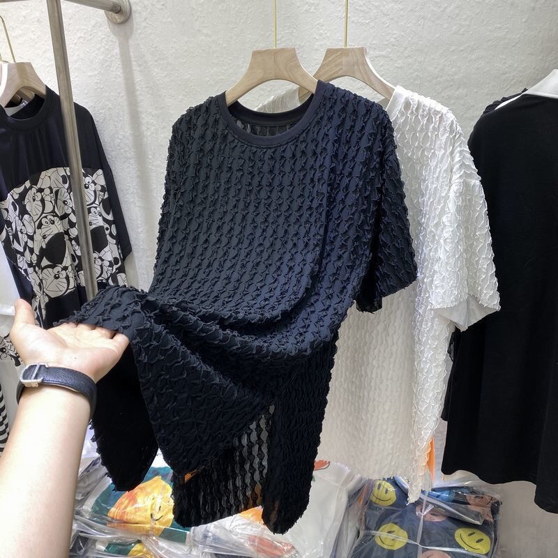 접힌 Auricularius 스티칭 쉬폰 셔츠 여성용 여름 느슨한 중간 길이 배꼽 덮음 2023 새로운 스플릿 반팔 티셔츠스토어 가기