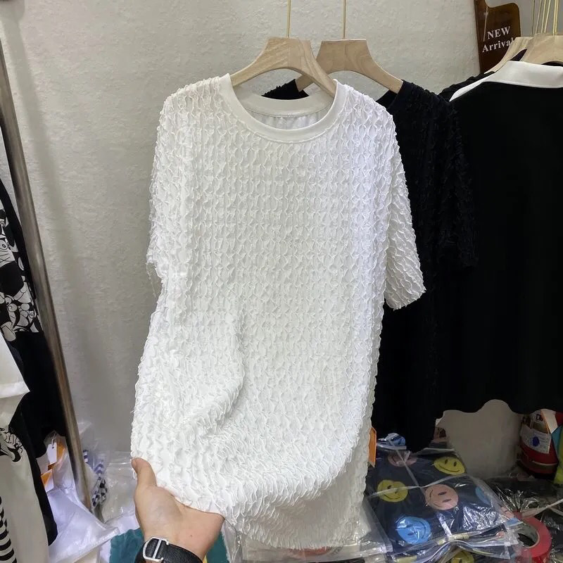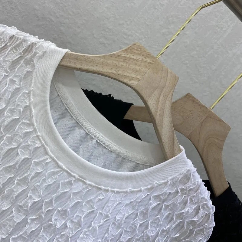 褶皱木耳边拼接雪纺衫女夏宽松中长款遮肚子2021新款开叉短袖T恤