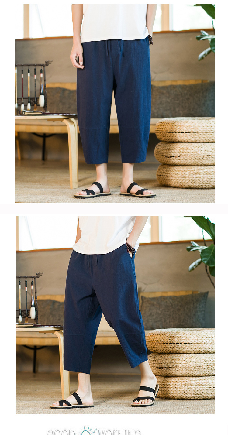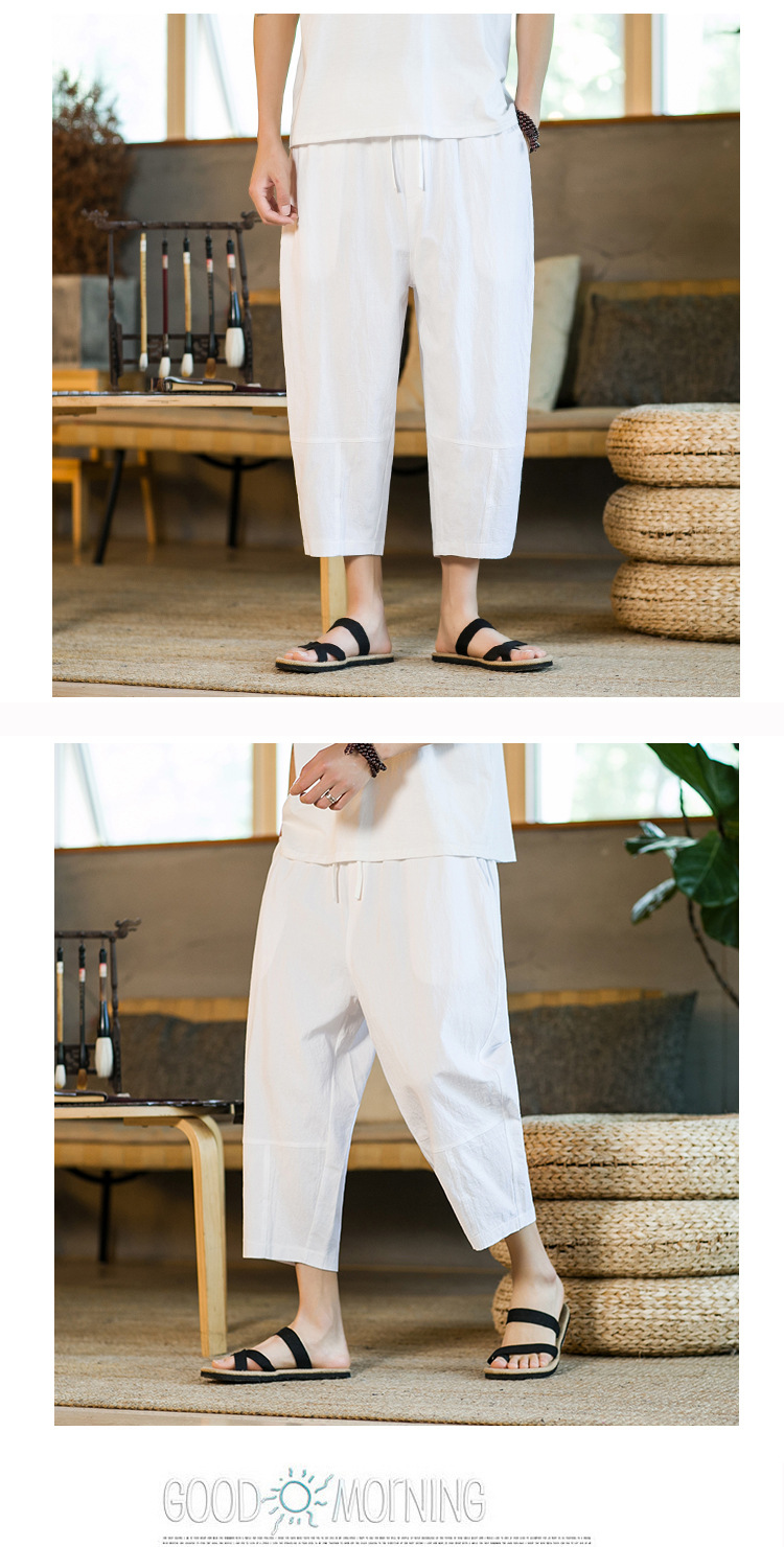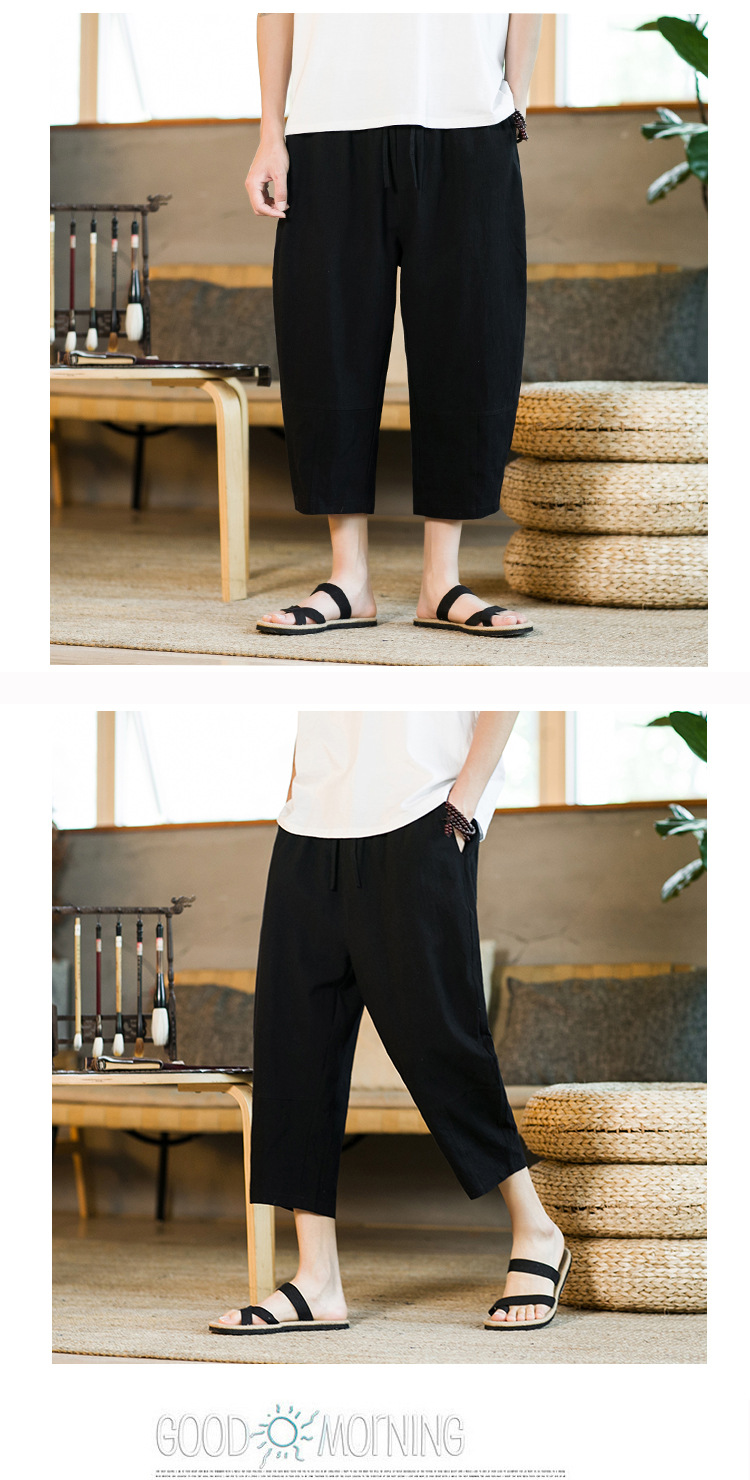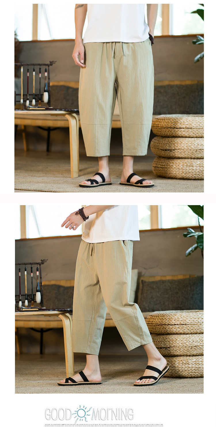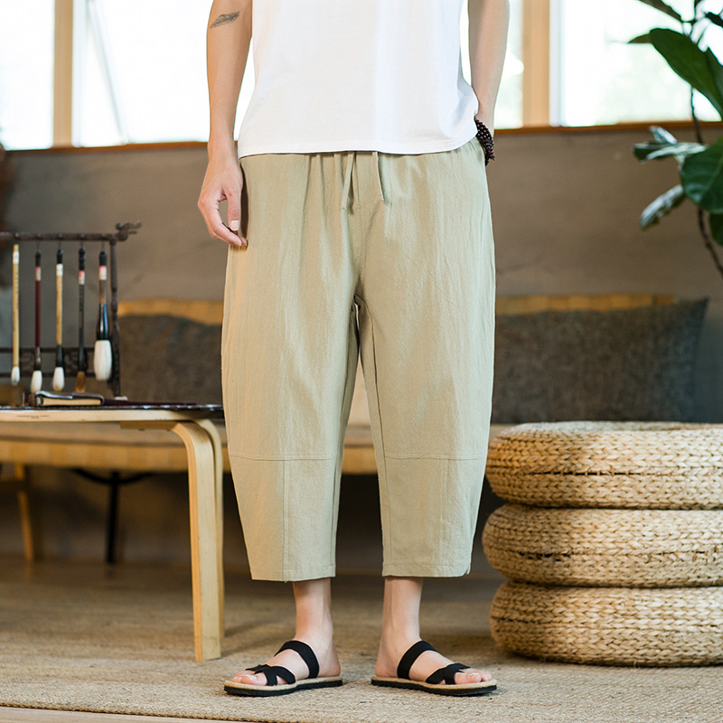 여름 캐주얼 바지 남자의 일본식 모든 매치 단색 면 린넨 느슨한 린넨 바지 한국 스타일 트렌디 스트레이트 남성 카프리 바지