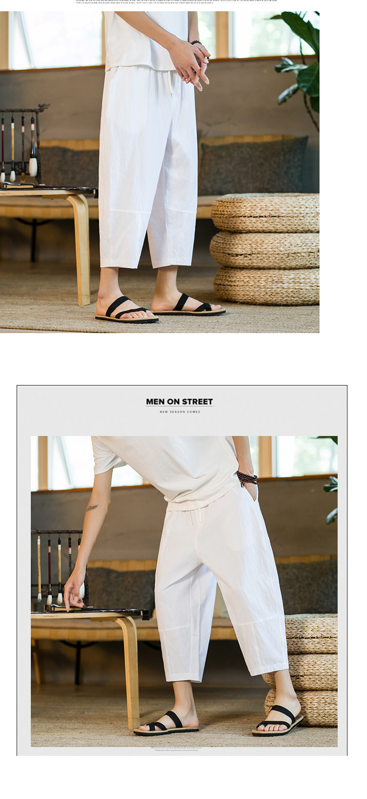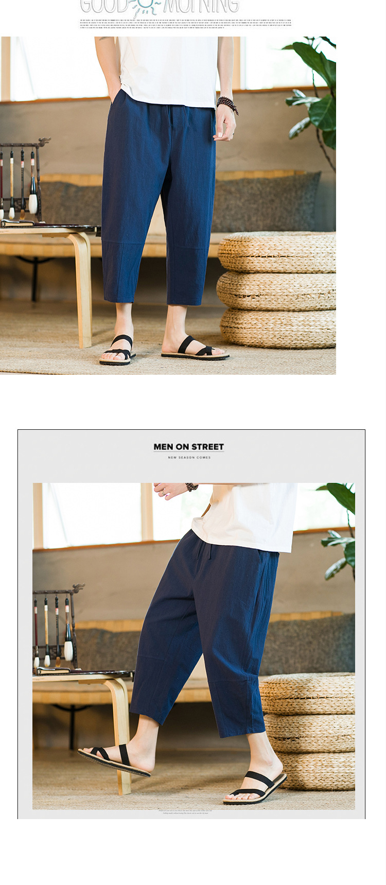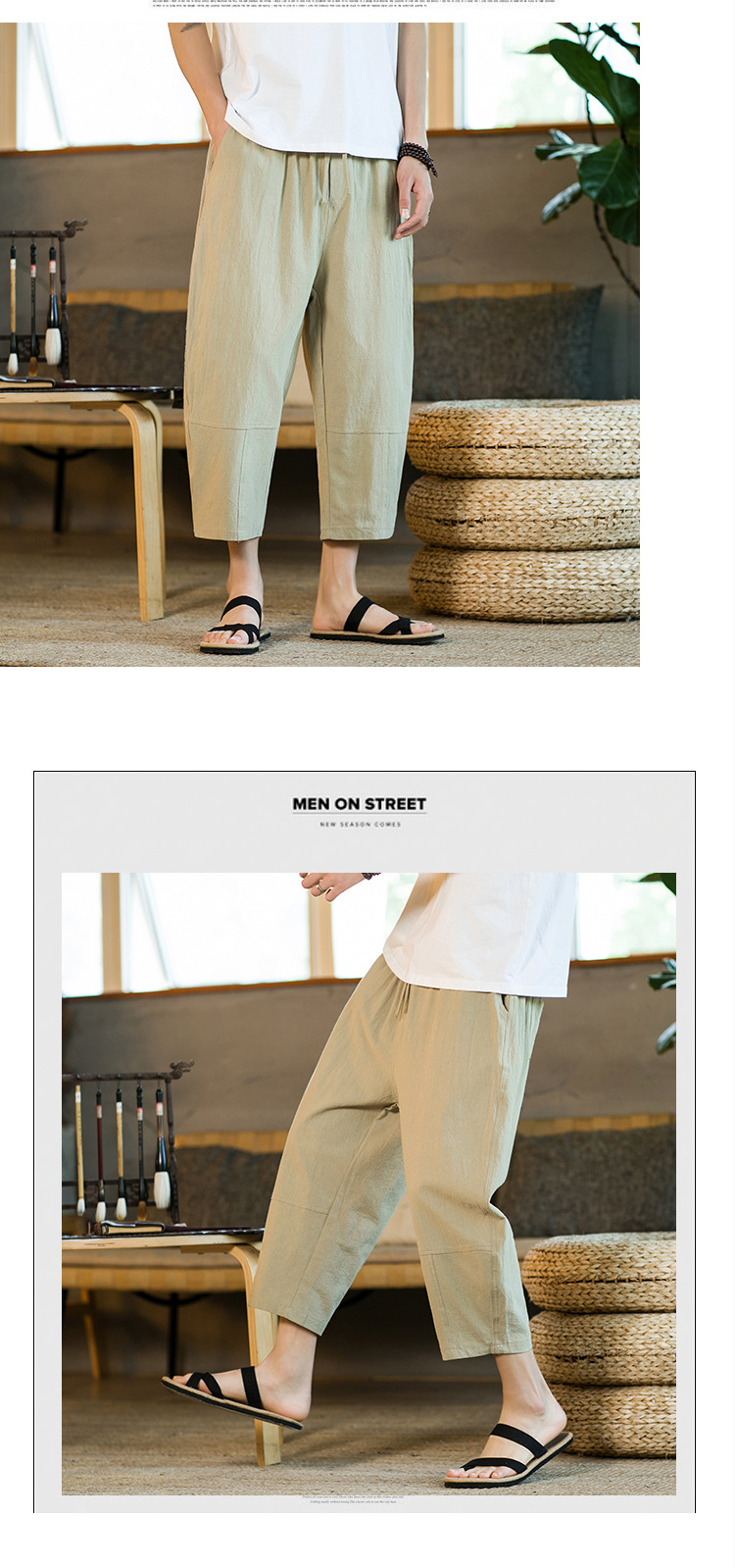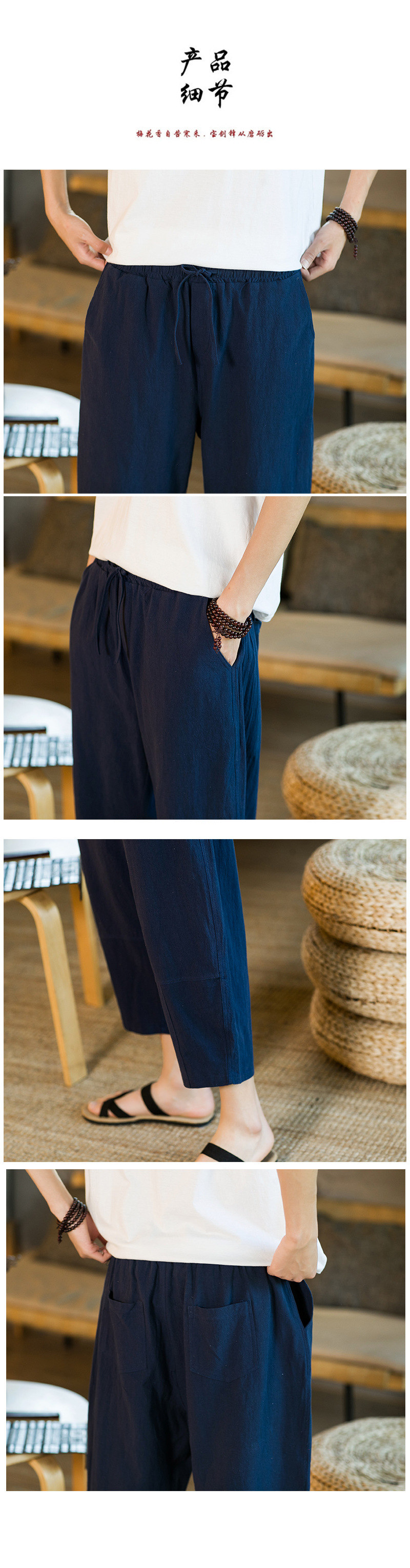 여름 캐주얼 바지 남자의 일본식 모든 매치 단색 면 린넨 느슨한 린넨 바지 한국 스타일 트렌디 스트레이트 남성 카프리 바지
