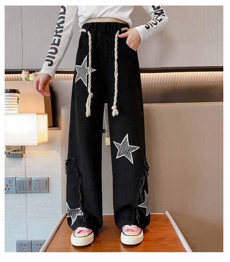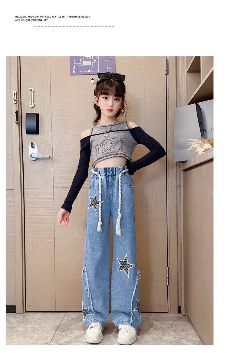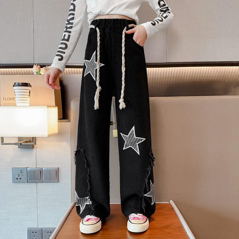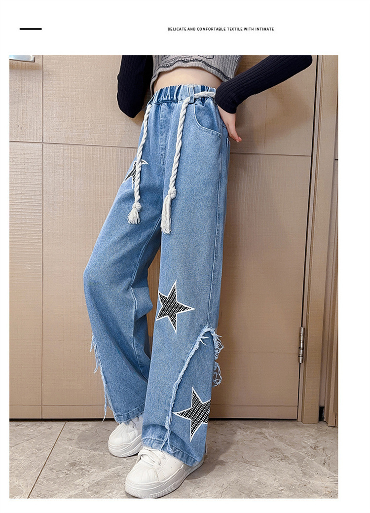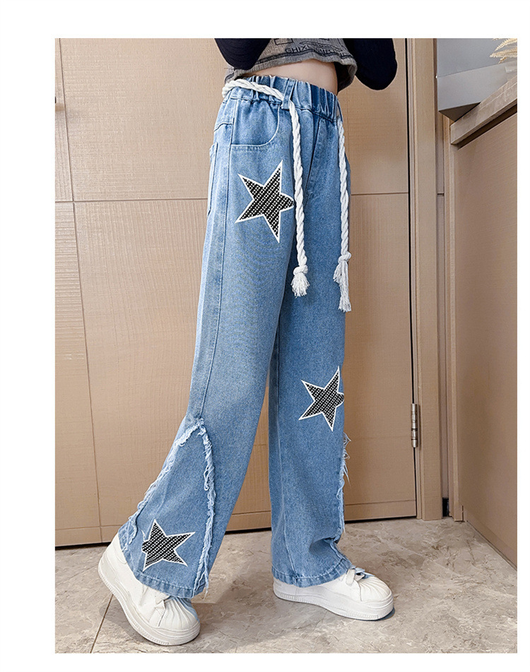 2025년 가을 신상 여아 데님 팬츠, 한국 스타일 중대형 아동용 오각형 데님 와이드 팬츠, 트렌디한 원피스 도매스토어 가기