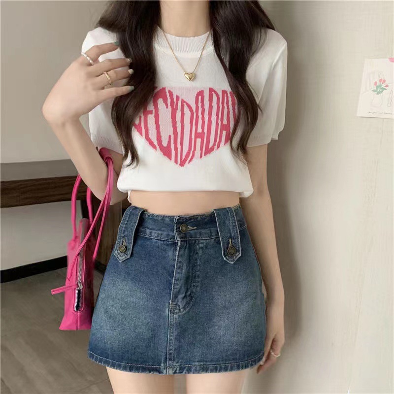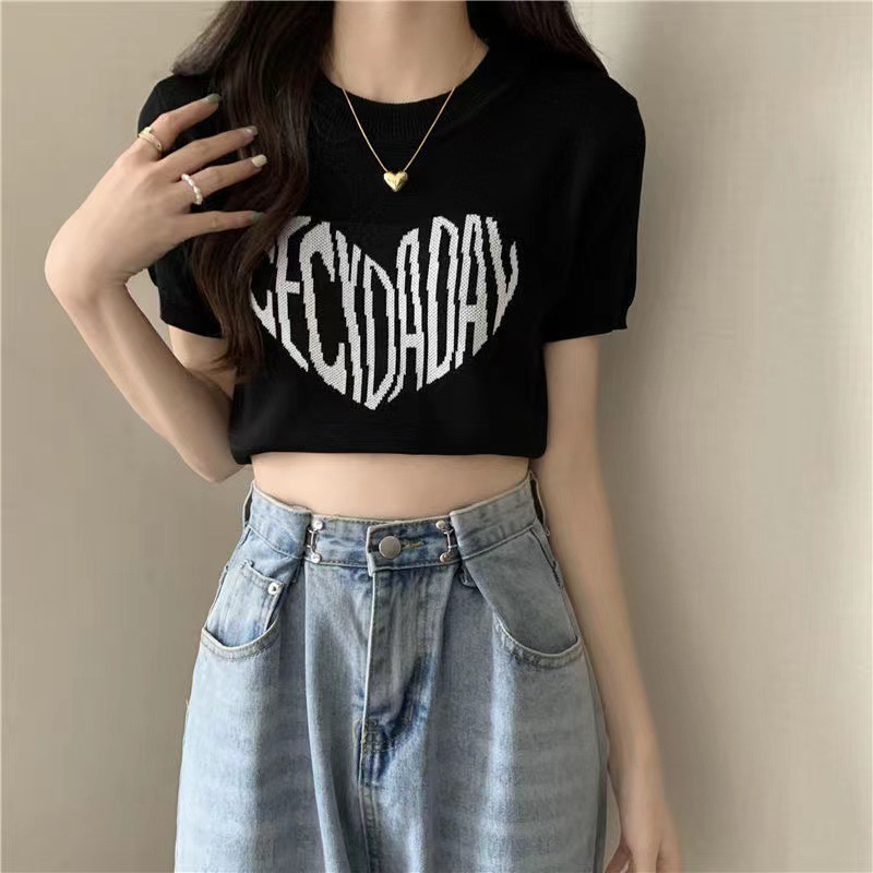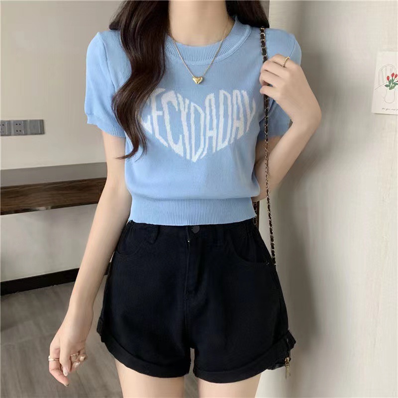 크로스 보더 동남아시아 러브 패턴 풀오버 짧은 라운드 넥 스웨터 여성용 여름 반팔 타이트 피규어 탑스토어 가기