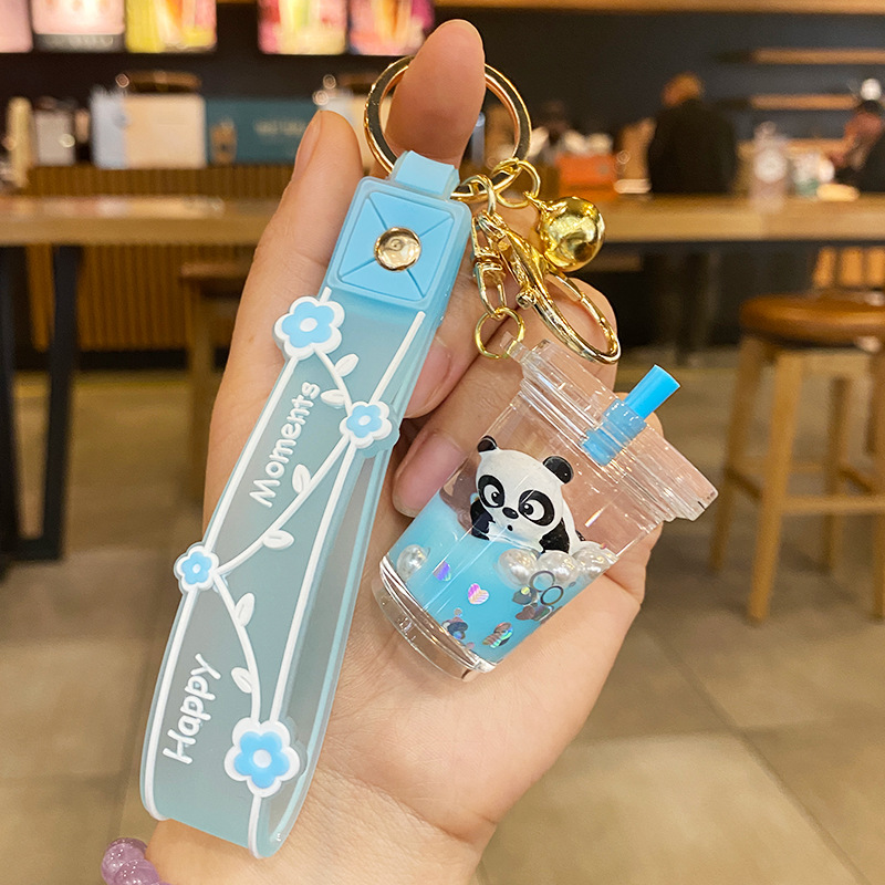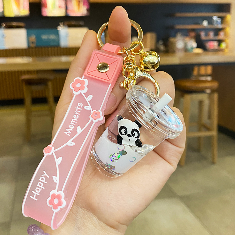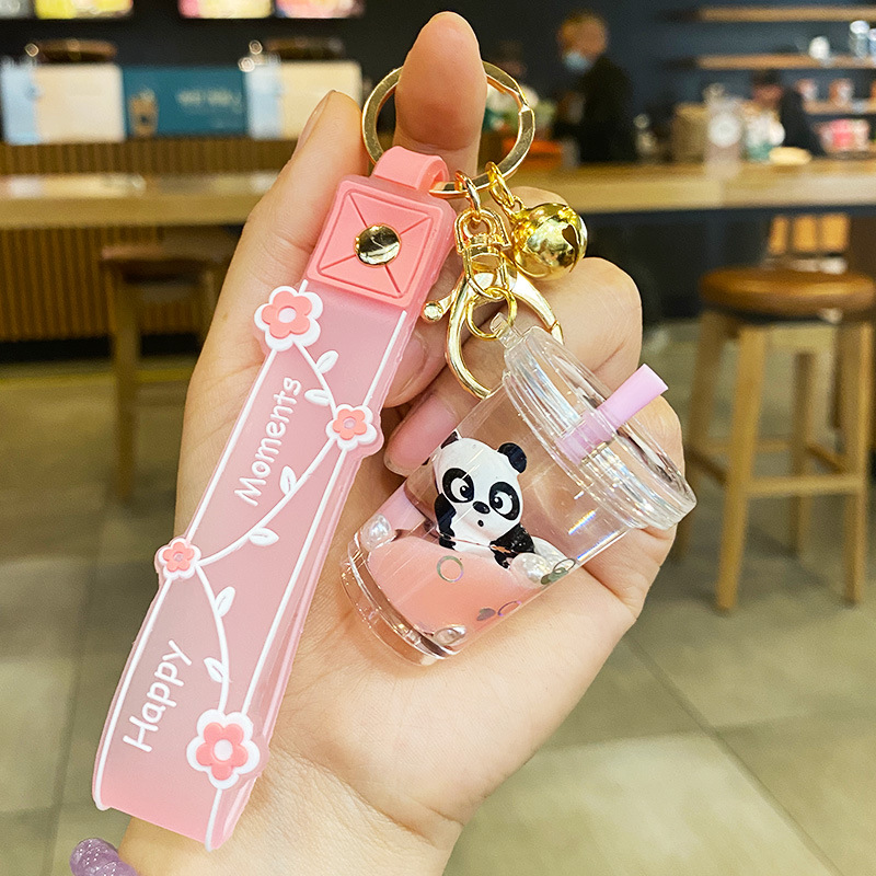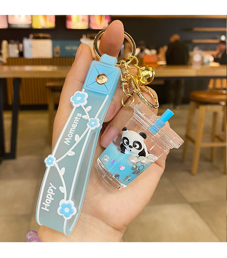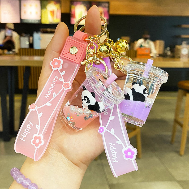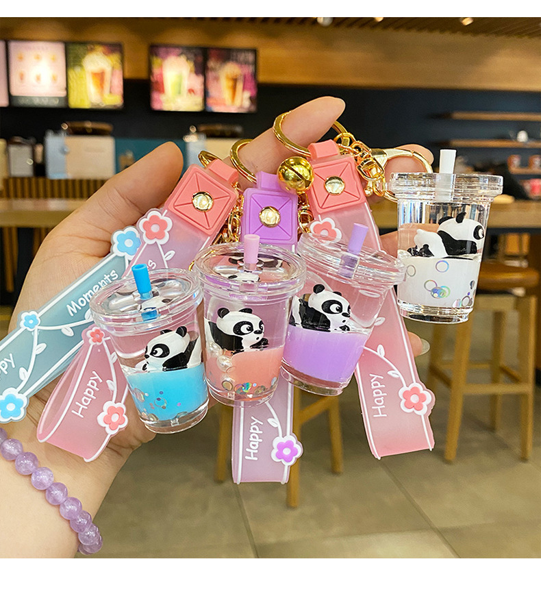 귀여운 팬더 퀵 샌드 키 체인 드리프트 병 우유 차 컵 액체 펜던트 학교 가방 자동차 펜던트 열쇠 고리 선물