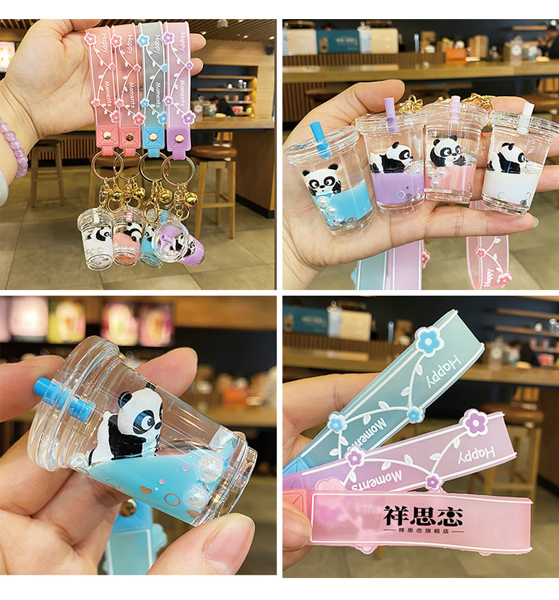 귀여운 팬더 퀵 샌드 키 체인 드리프트 병 우유 차 컵 액체 펜던트 학교 가방 자동차 펜던트 열쇠 고리 선물스토어 가기