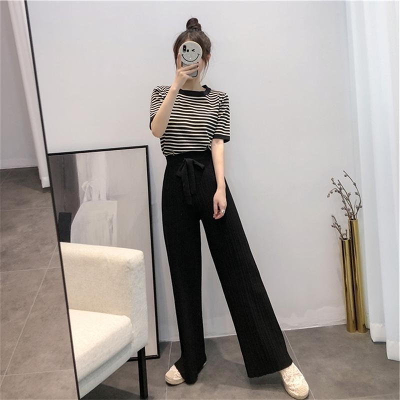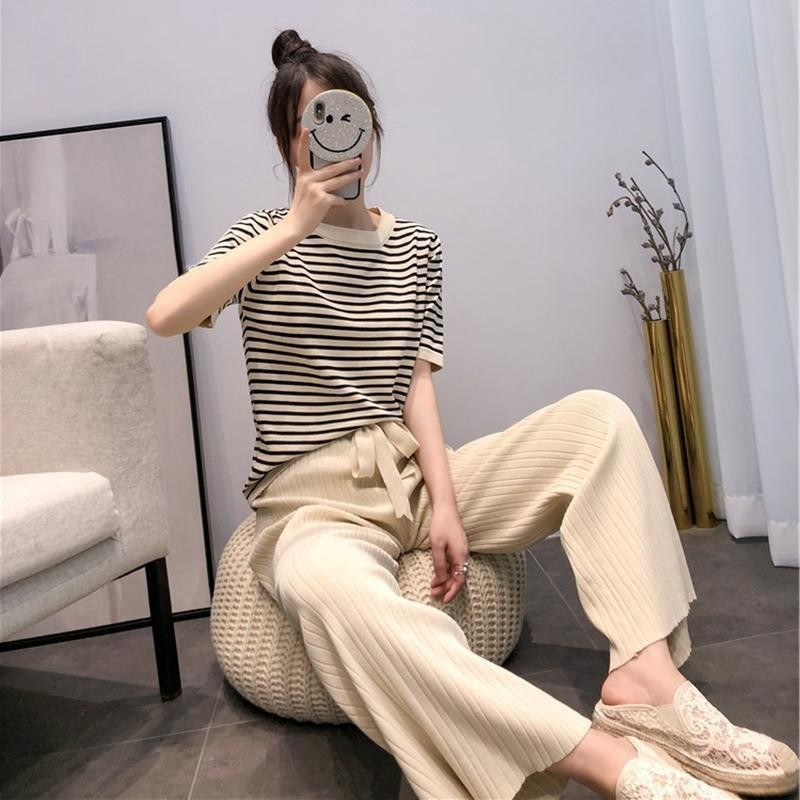 2025년 여름 홍콩 스타일 아이스 실크 니트 반팔 티셔츠 여성용 패셔너블한 스타일로 작은 키에도 날씬해 보이는 스트라이프 이너웨어스토어 가기