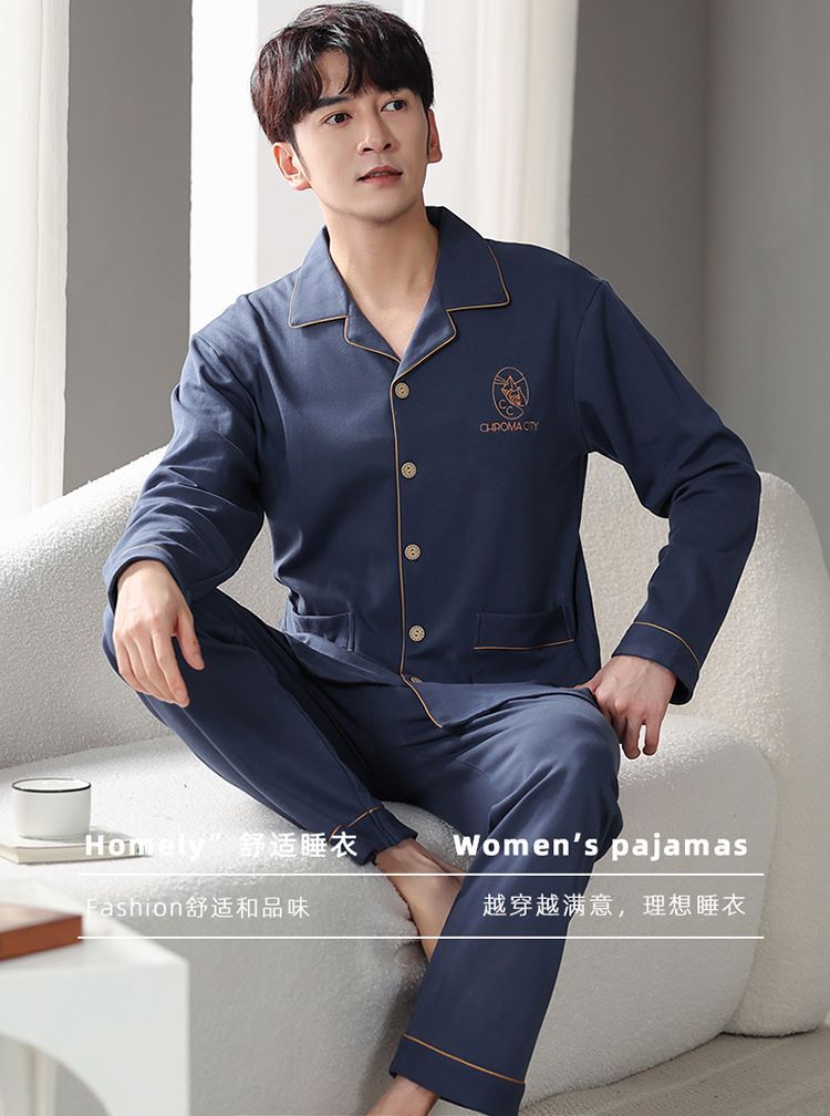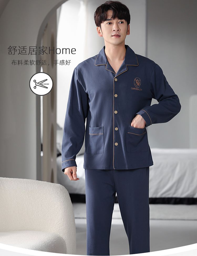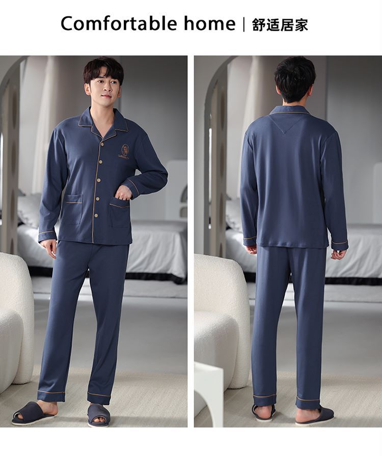 순면 잠옷 남자의 봄과 가을 긴 소매 간단한 단색 카디건 청소년 플러스 사이즈 캐주얼 가정 옷 세트 여름