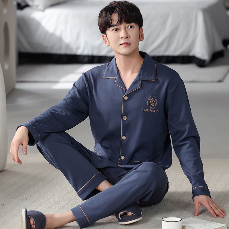 순면 잠옷 남자의 봄과 가을 긴 소매 간단한 단색 카디건 청소년 플러스 사이즈 캐주얼 가정 옷 세트 여름스토어 가기