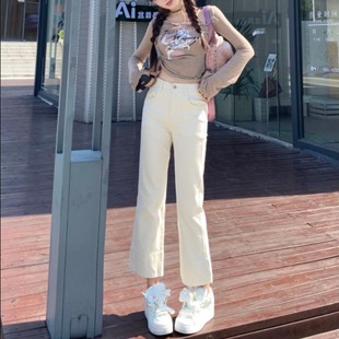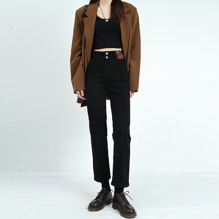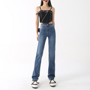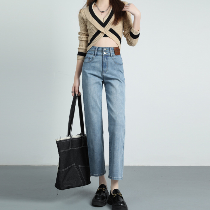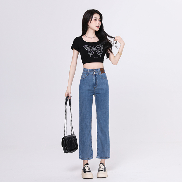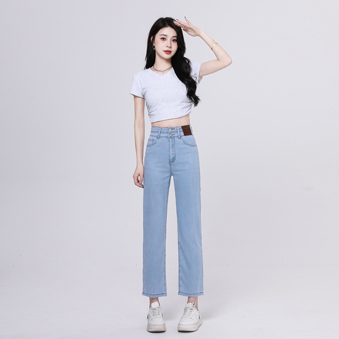2023年春夏新款窄版阔腿牛仔裤女弹力小直筒高腰显瘦烟管裤长裤