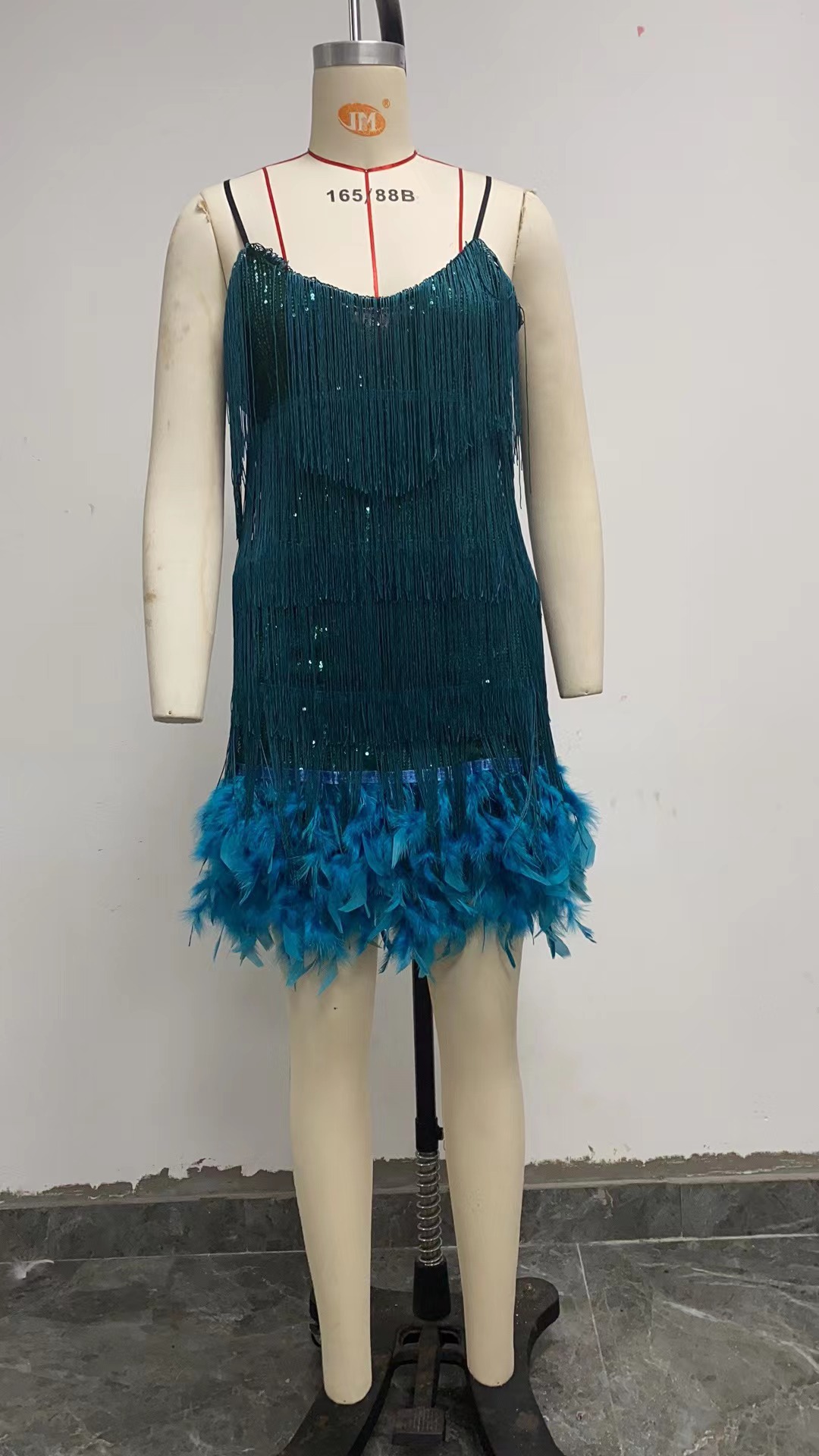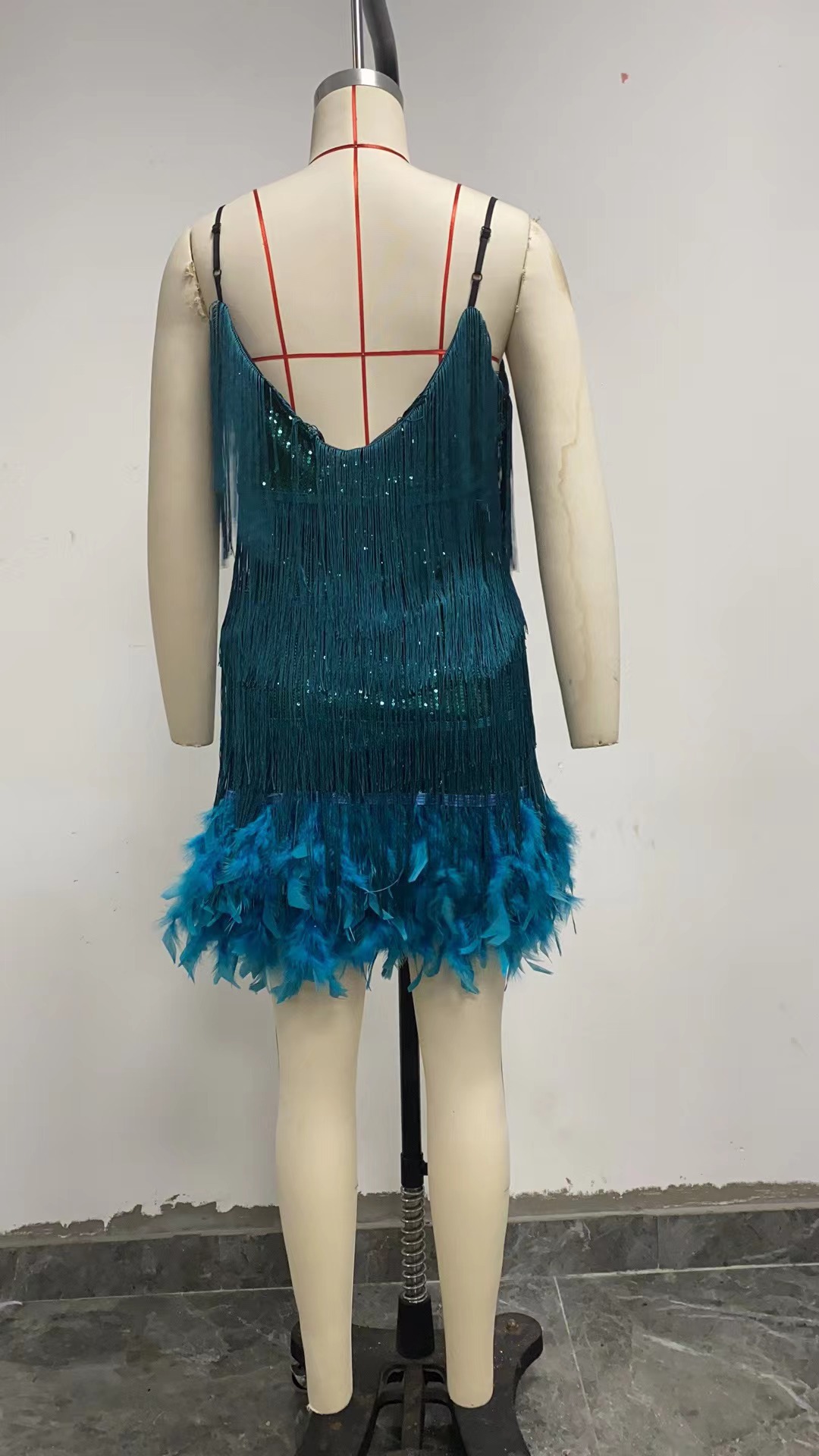 2025 패션 술 장식 조각 여러 가지 빛깔의 생일 파티 섹시한 v 넥 스트랩 깃털 스티치 가운 드레스스토어 가기