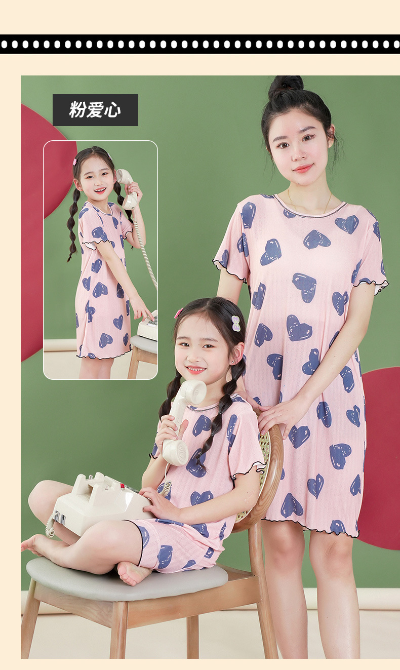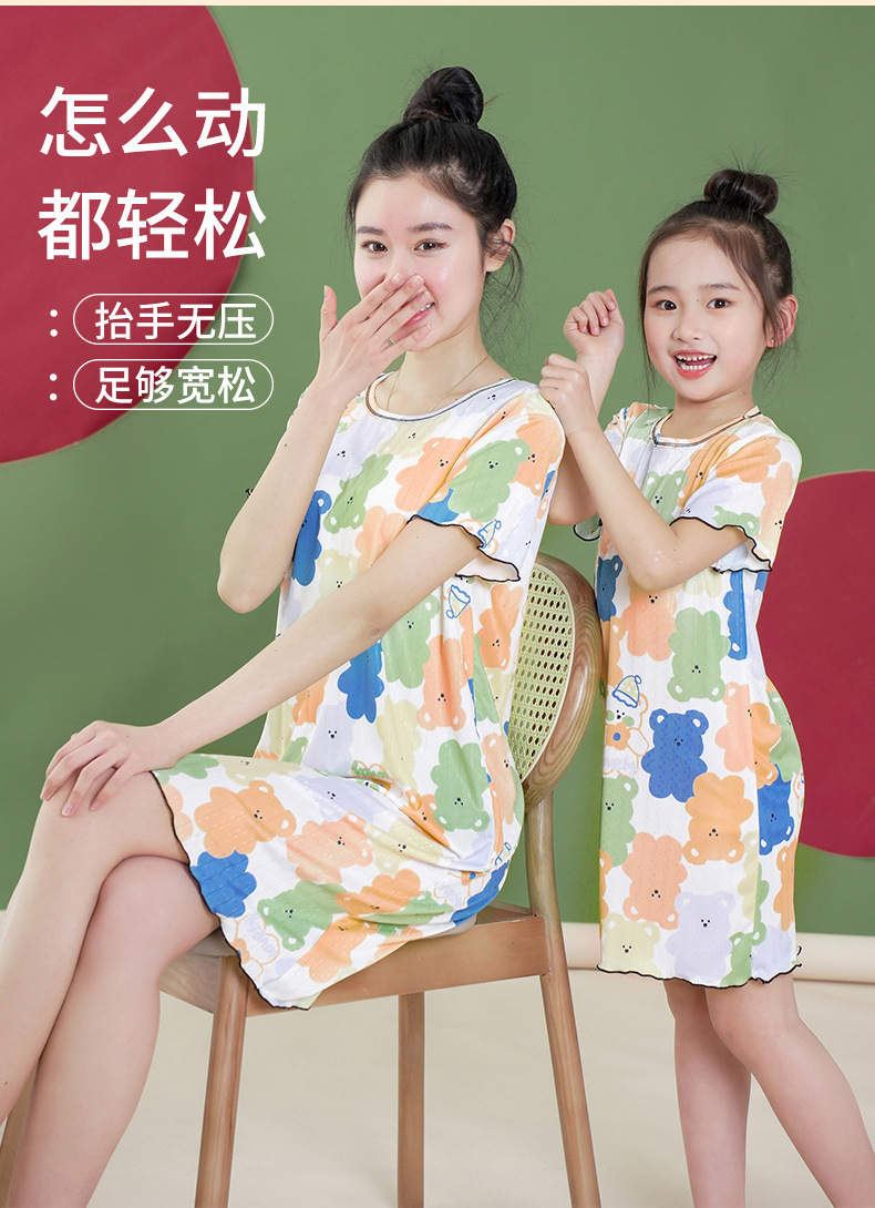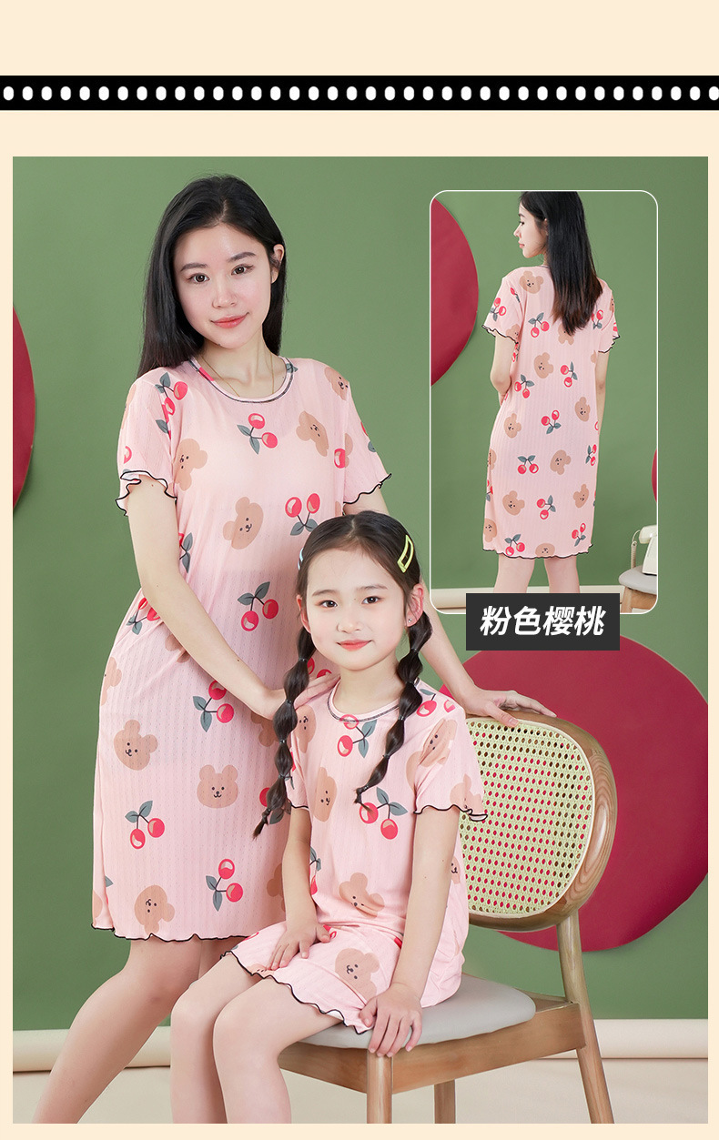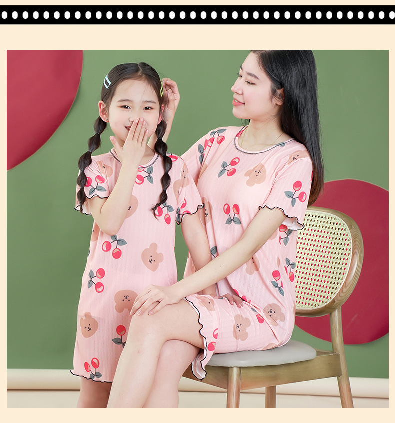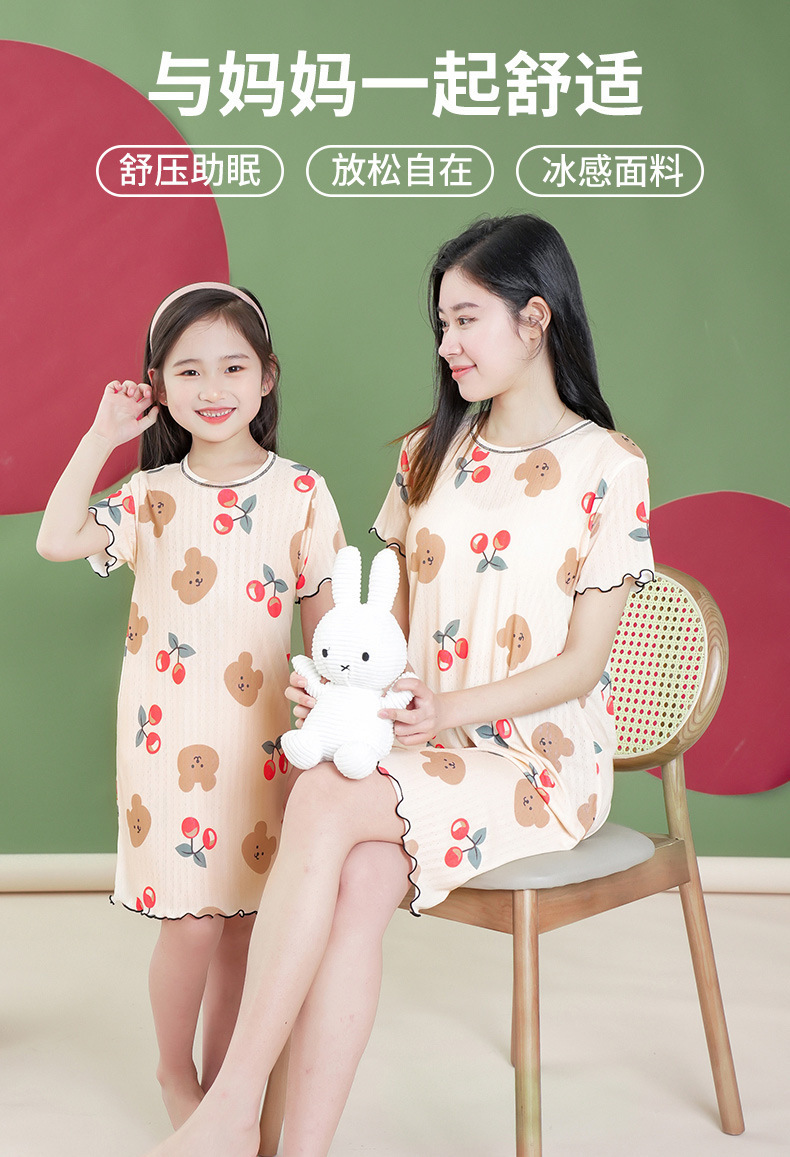 冰丝女童睡裙卡通亲子装家居裙子儿童夏季薄款小童花边母女睡衣裙