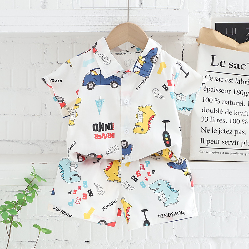 2023 여름 새로운 남아 풀 프린트 라펠 셔츠 소년과 아기를 위한 반팔 세트 투피스 캐주얼 반바지