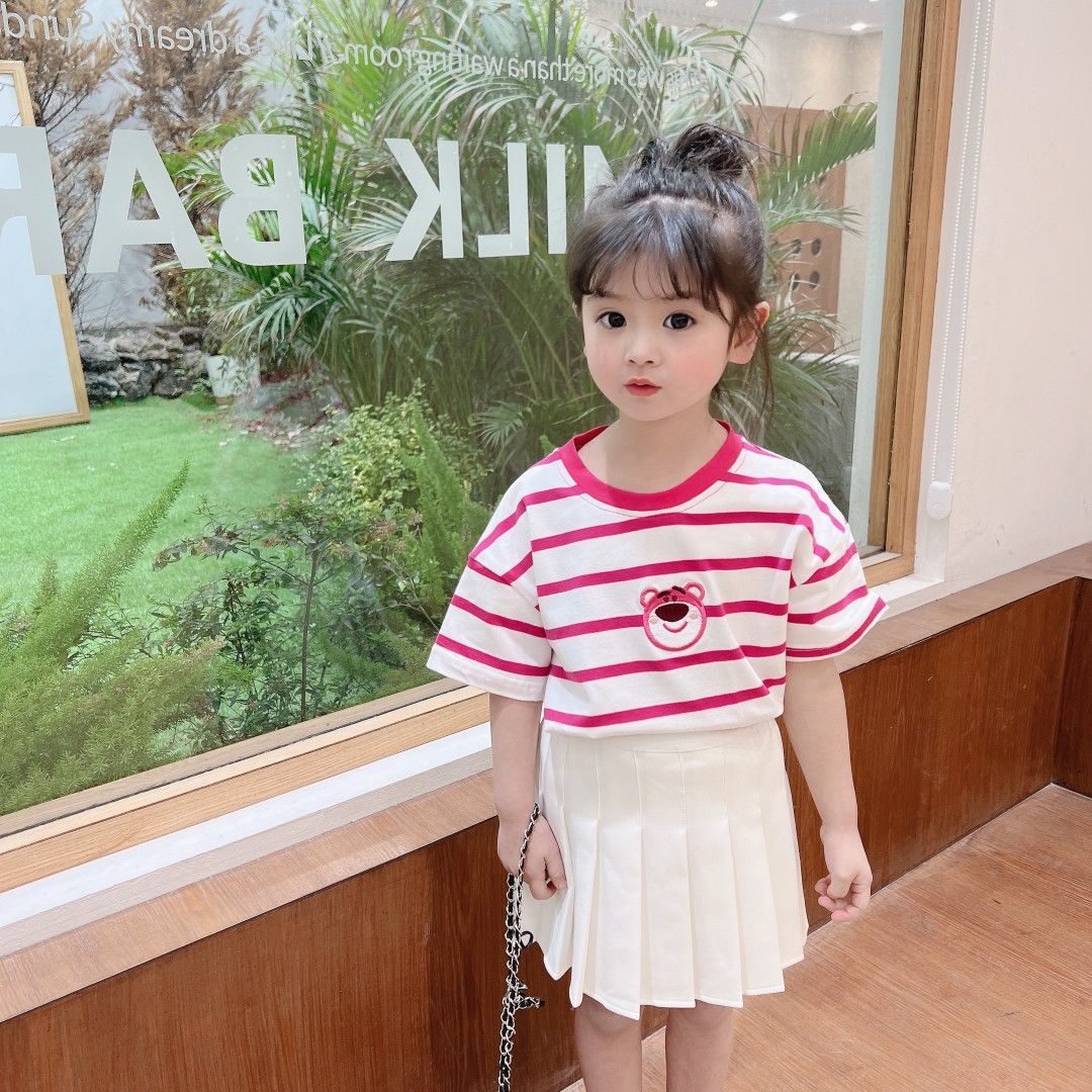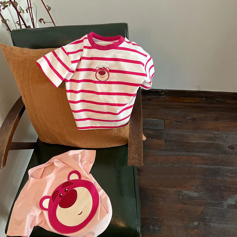 여아 반팔 여름 티셔츠 어린이 반팔 딸기 곰 만화 자수 탑 어린이 유행 느슨한 옷