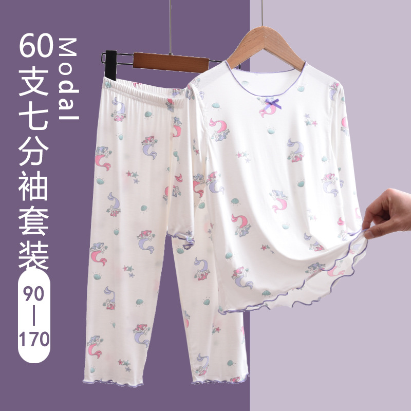 60 모달 소녀 잠옷 얇은 7 소매 어린이 여름 에어컨 옷 긴 소매 가정 옷 세트