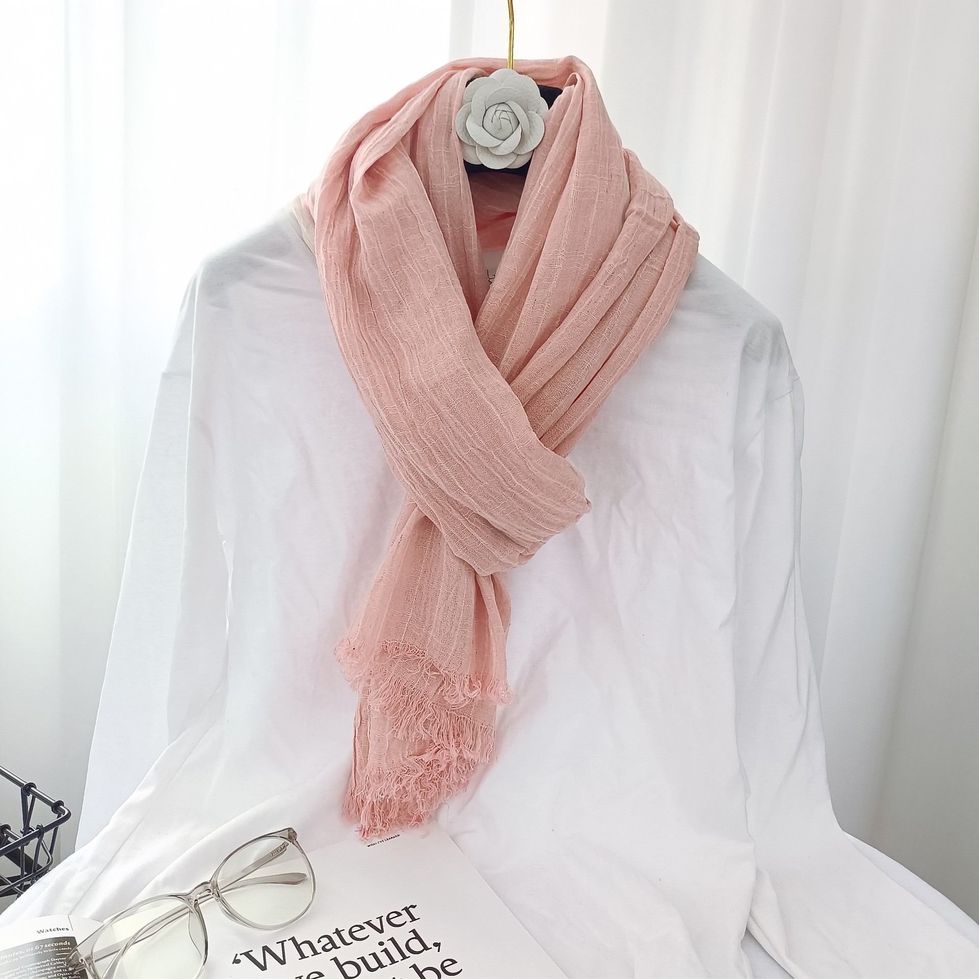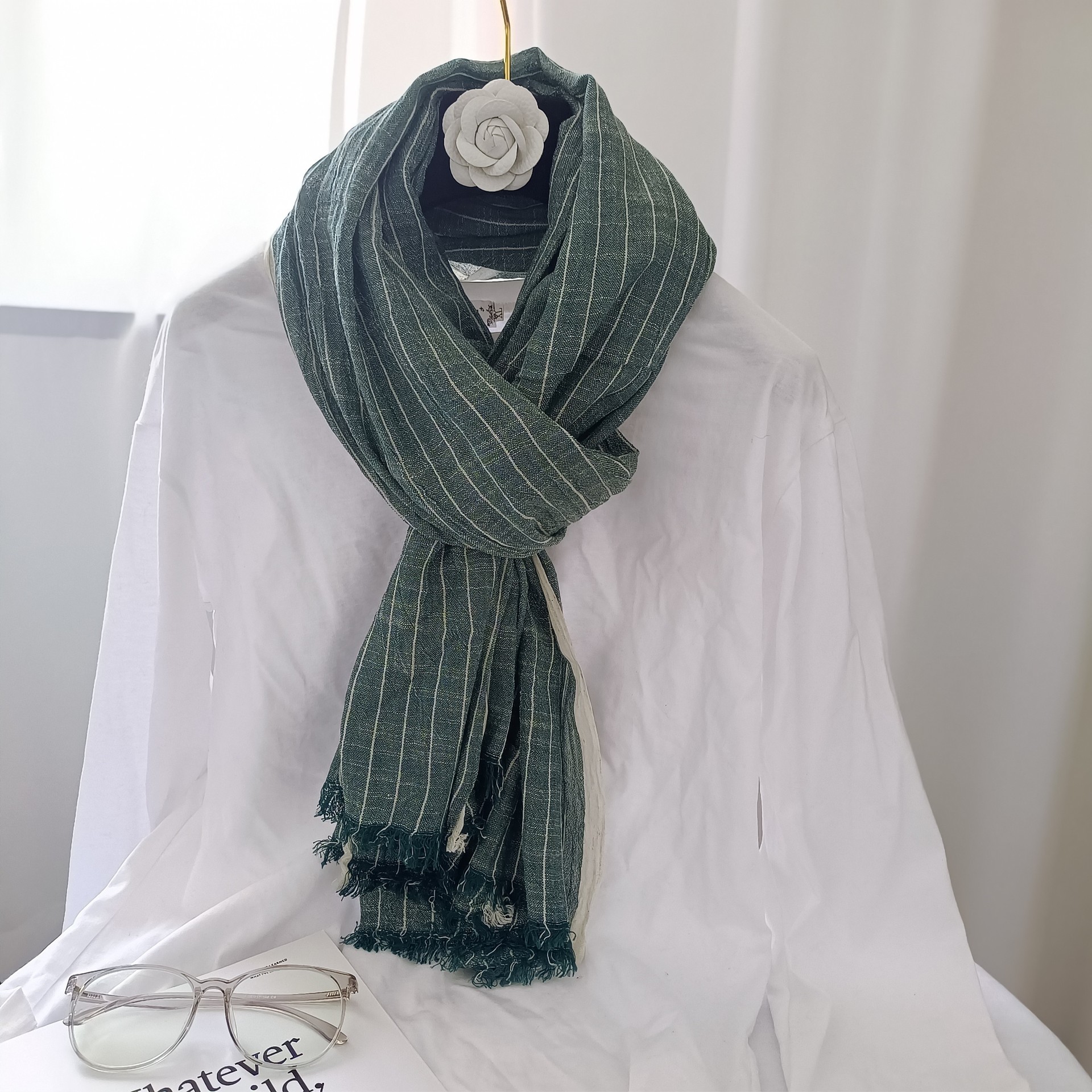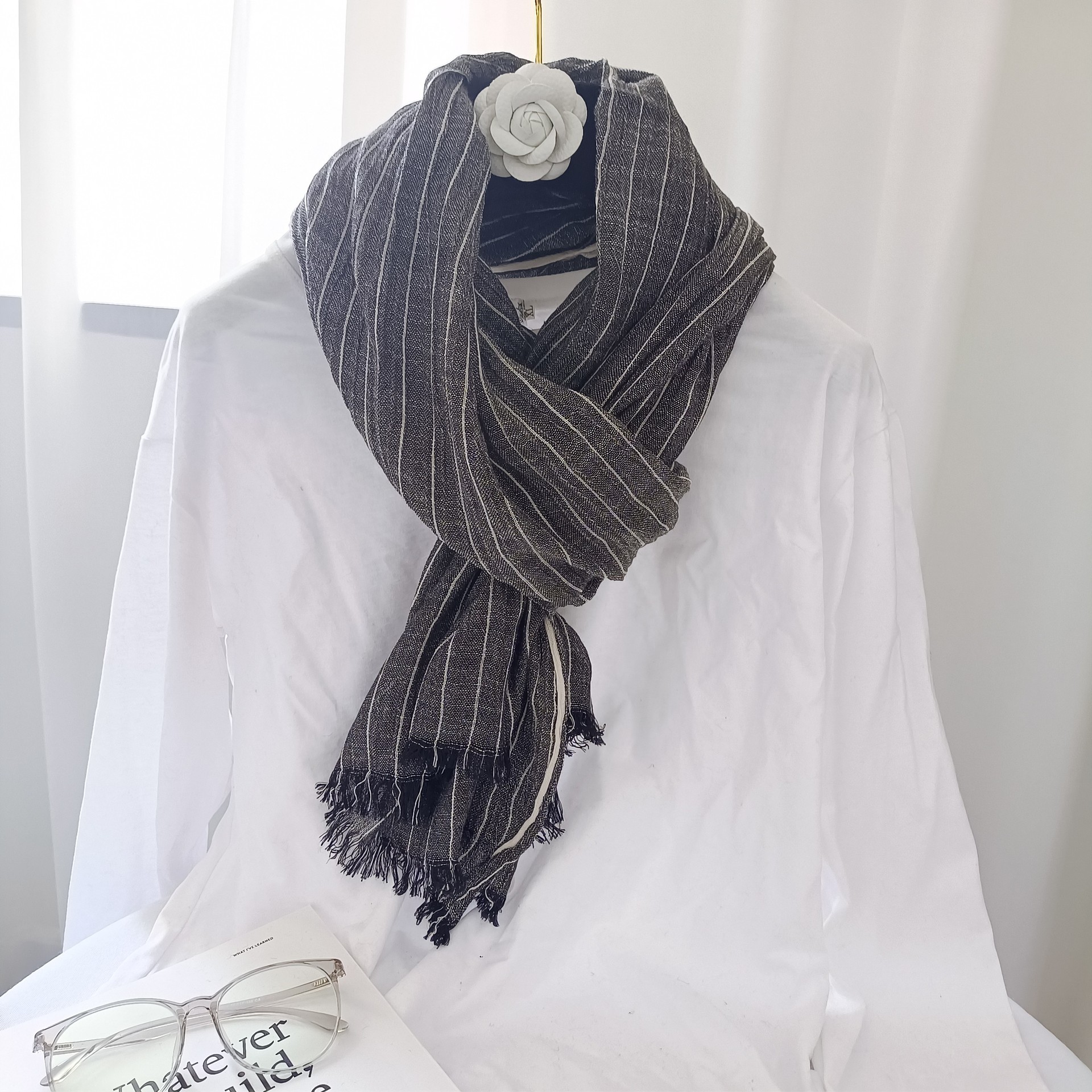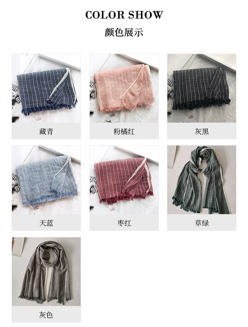 일본의면과 린넨 스카프 여성의 봄과 가을 2023 얇은 빈티지 예술적 술 숄 롱 스트라이프 린넨 와이스토어 가기