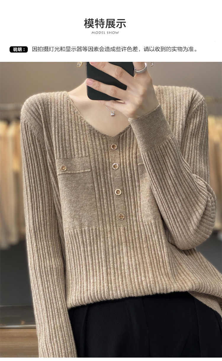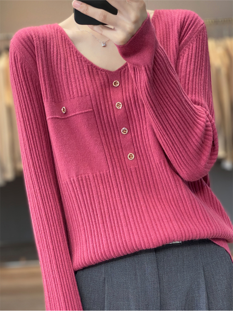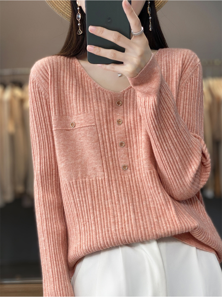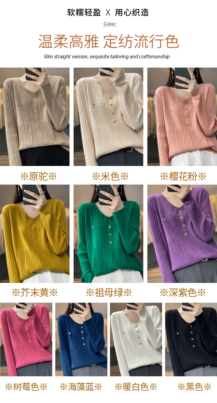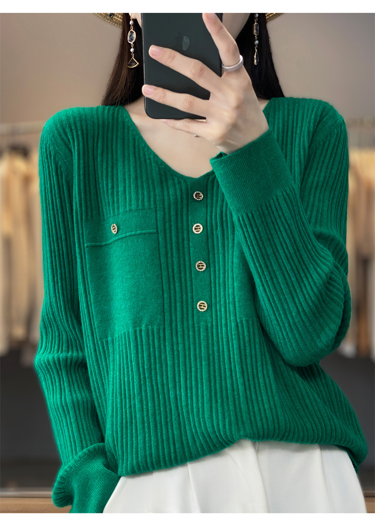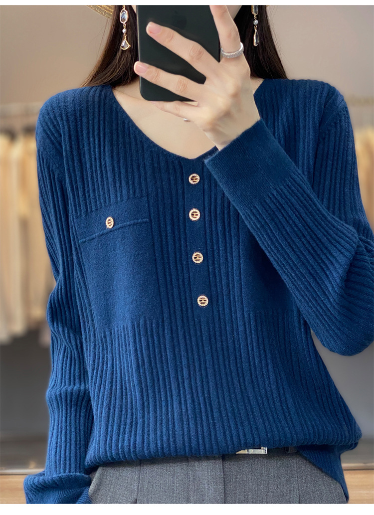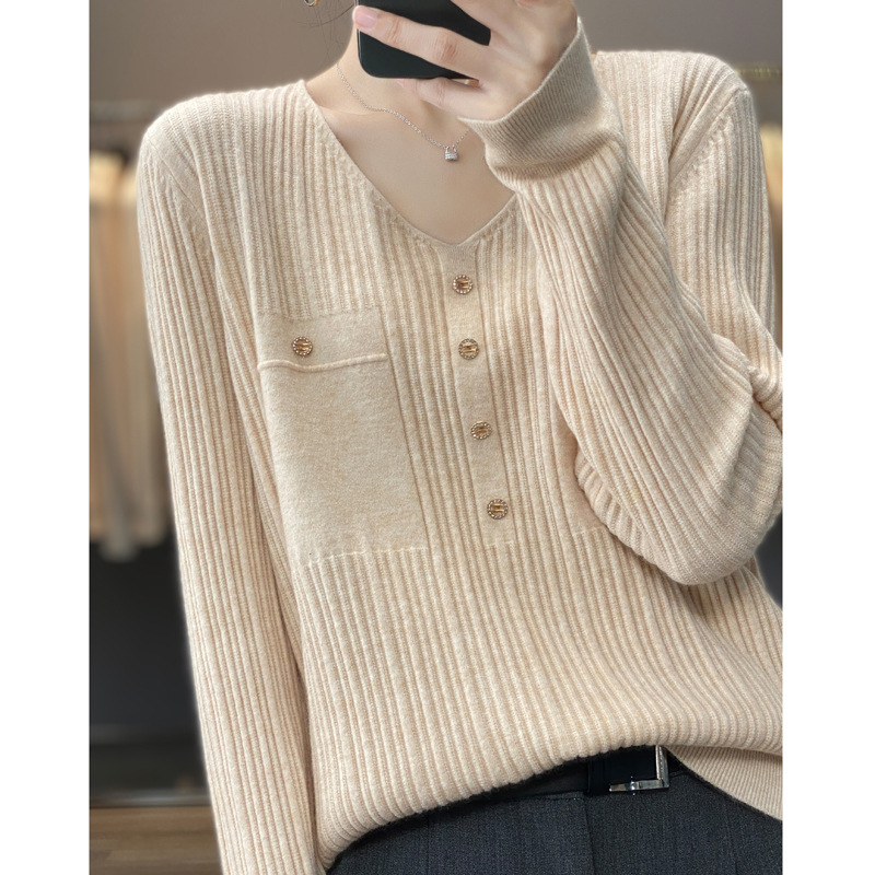 울 혼방 봄과 가을 새로운 V-넥 니트 스웨터 여성용 겉옷 스웨터 베이스 셔츠가있는 느슨한 슬리밍 탑 트렌디