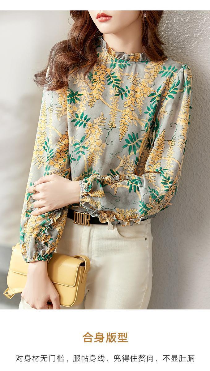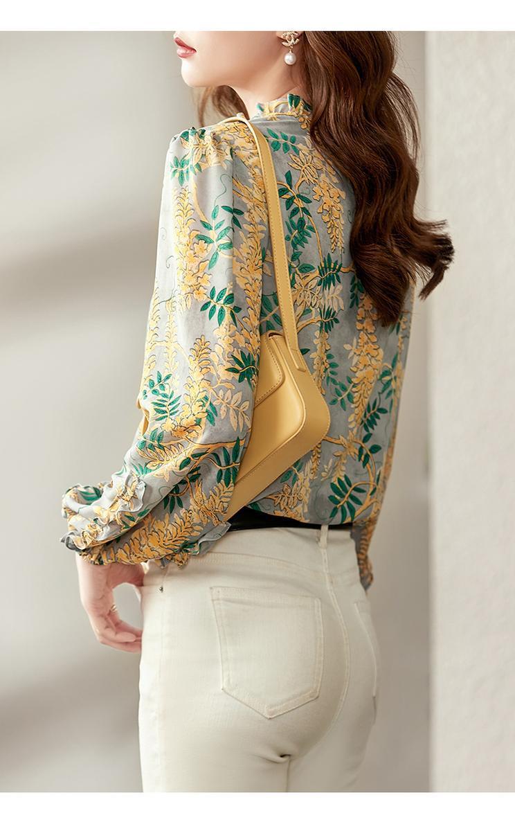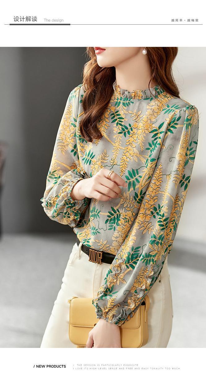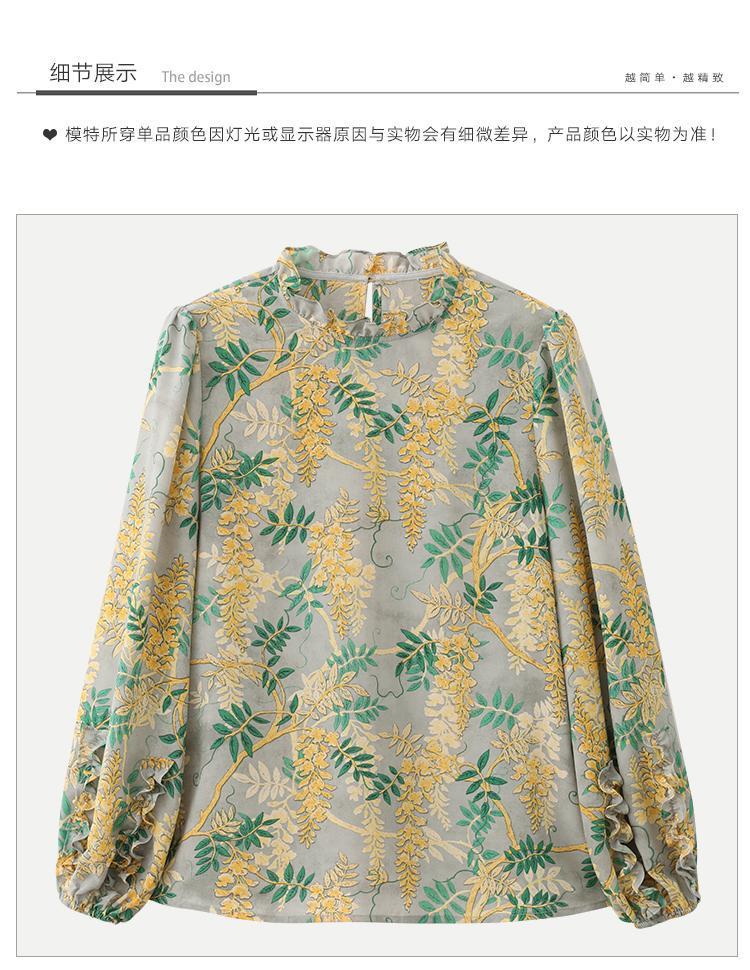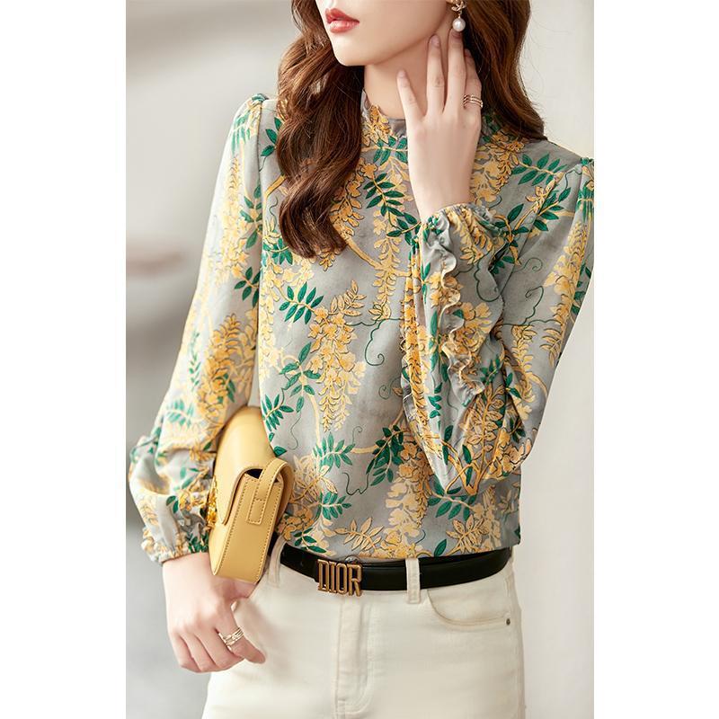 2025년 유행 스타일의 스탠드 칼라 플로럴 시폰 셔츠 여성용 러플 탑, 웨이브 엣지 베이스 셔츠스토어 가기