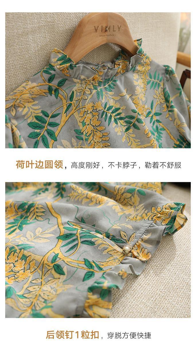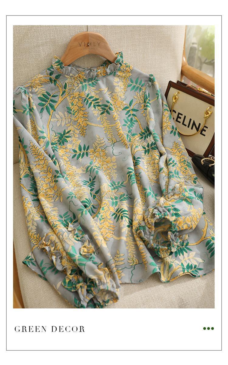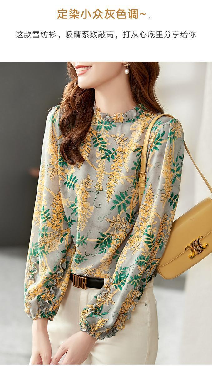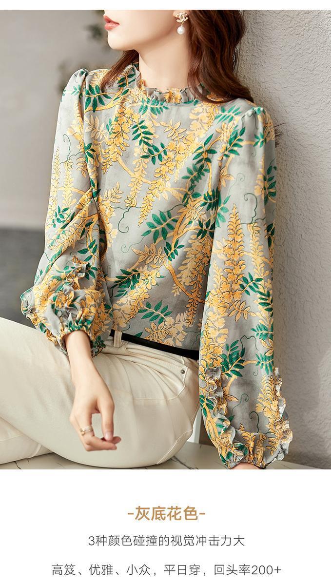 2025년 유행 스타일의 스탠드 칼라 플로럴 시폰 셔츠 여성용 러플 탑, 웨이브 엣지 베이스 셔츠스토어 가기