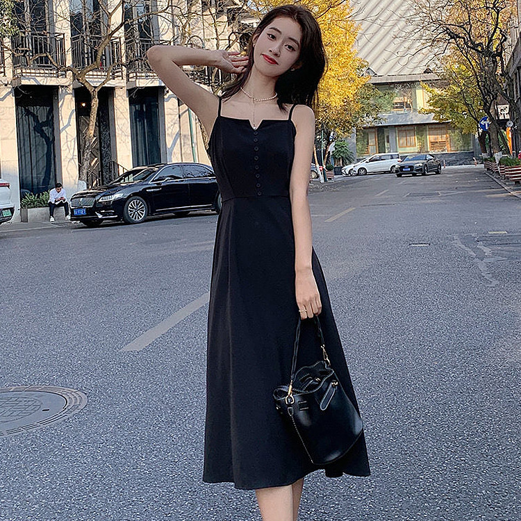 2023 프렌치 햅번 스타일 블랙 슬링 원피스 여성용 여름 하이 웨이스트 슬리밍 스커트 슬림핏 허리 A 라인 롱 원피스스토어 가기