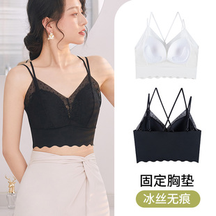 夏季冰丝无痕小吊带固定一体乳胶杯垫裹胸交叉性感美背内衣