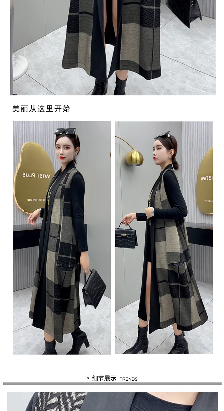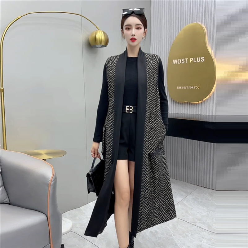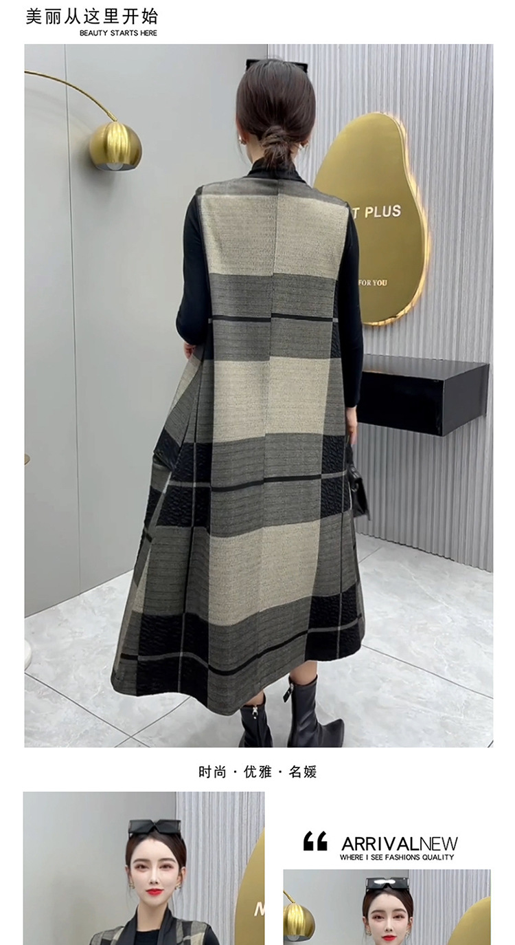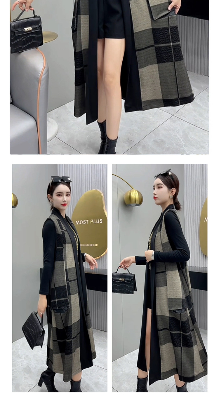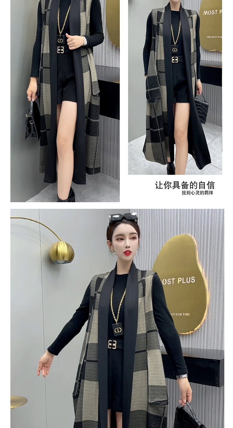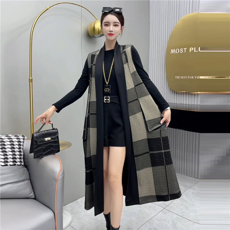 윈드 브레이커 조끼 여성의 가을 중간 길이 아우터 카디건 2022 새로운 가을과 겨울 긴 조끼 격자 무늬 무릎 위 코트스토어 가기