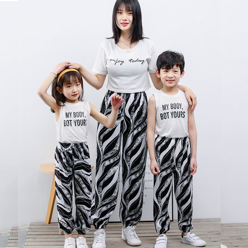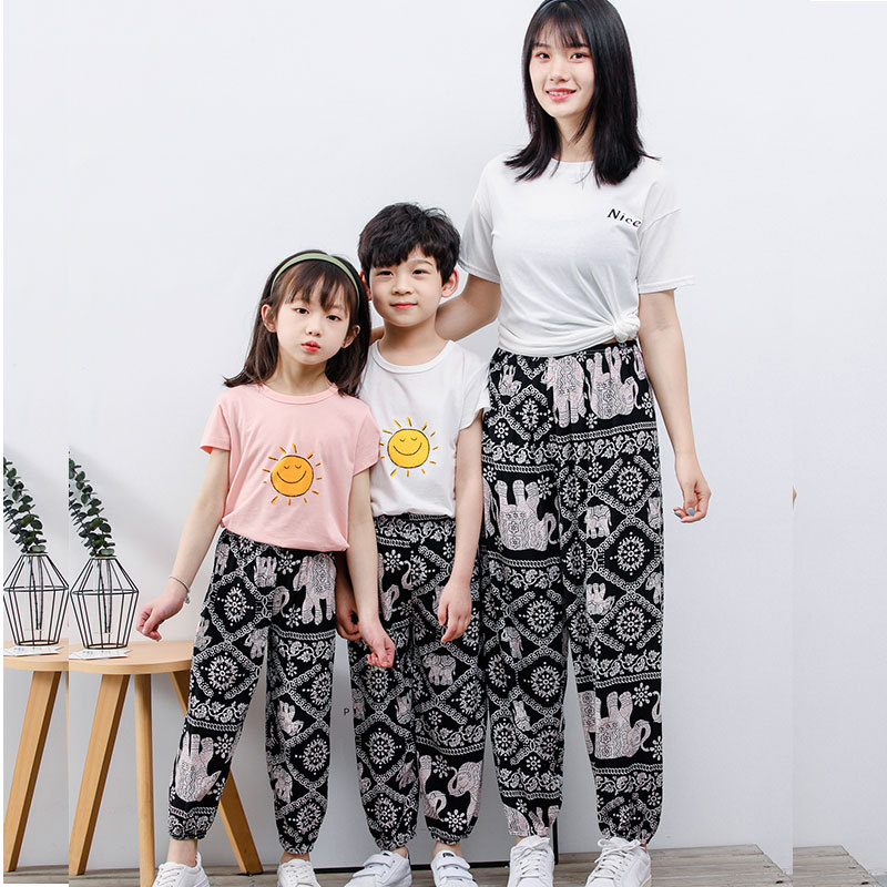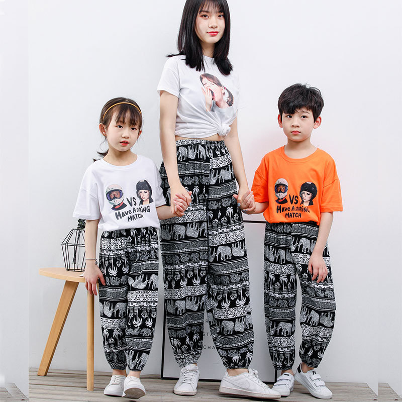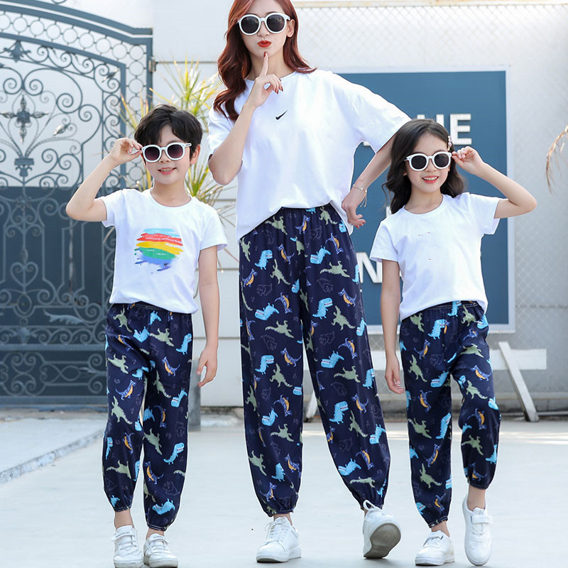 여름 얇은 부모-자식 다리 모기 방지 바지 큰 어린이 느슨한 통기성 캐주얼 홈 잠옷 바지 인쇄 비치 바지스토어 가기