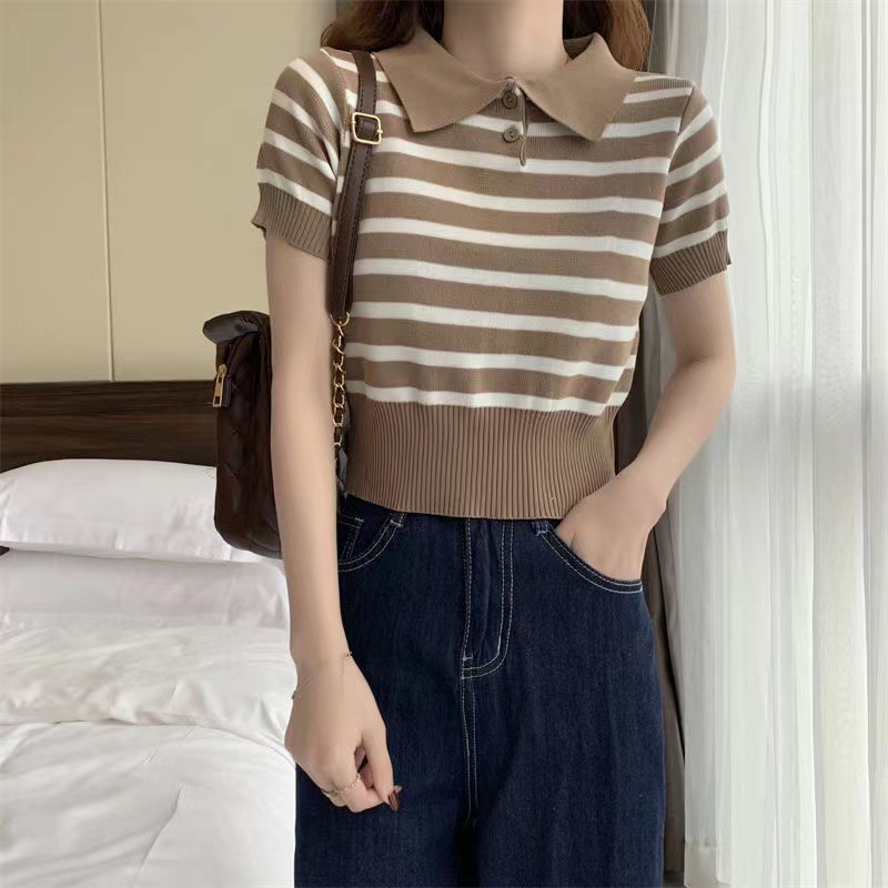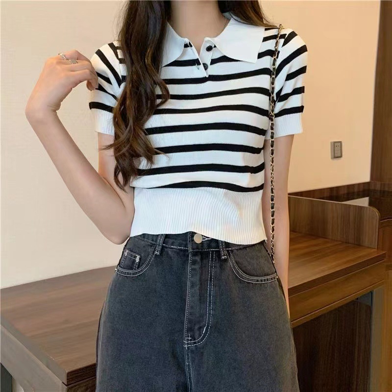 스트라이프 반팔 짧은 스웨터 여성용 여름 새로운 한국식 POLO 라펠 여성용 얇은 슬림핏 쇼트 탑스토어 가기