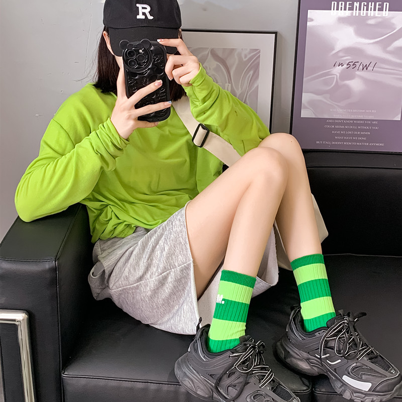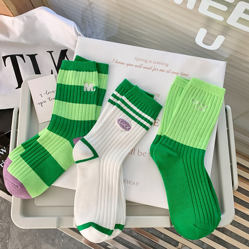 더블 니들 자수-그린 스타일 양말 여성용 중간 길이 양말 봄과 여름 스트라이프 대조 색상 긴 튜브 면 양말 인스 타 그램 인기 스타일스토어 가기