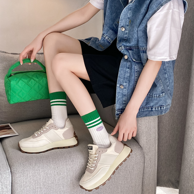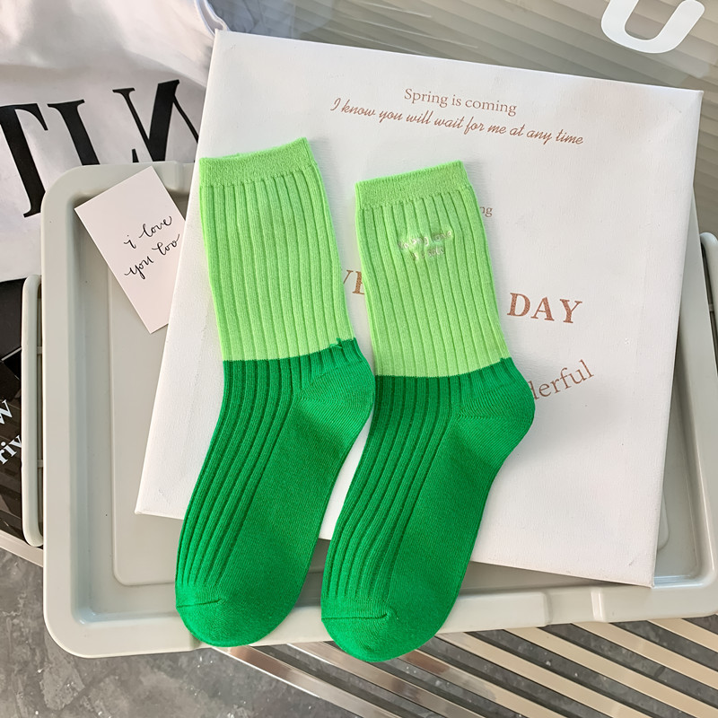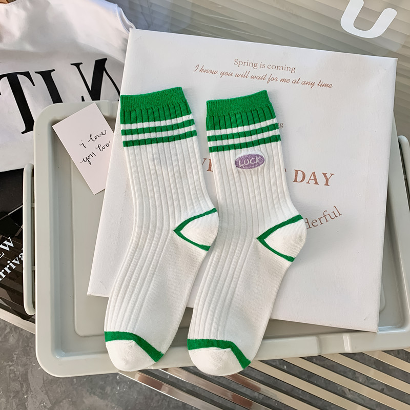 더블 니들 자수-그린 스타일 양말 여성용 중간 길이 양말 봄과 여름 스트라이프 대조 색상 긴 튜브 면 양말 인스 타 그램 인기 스타일