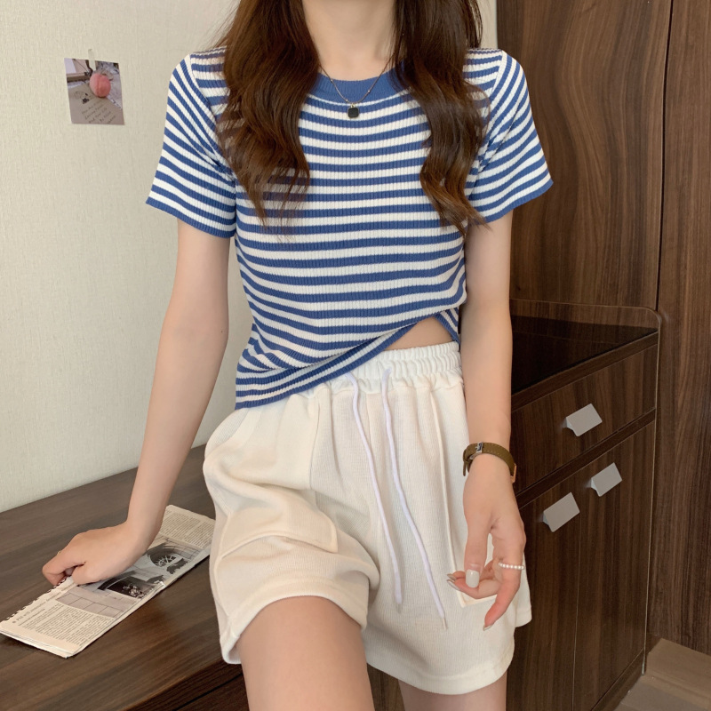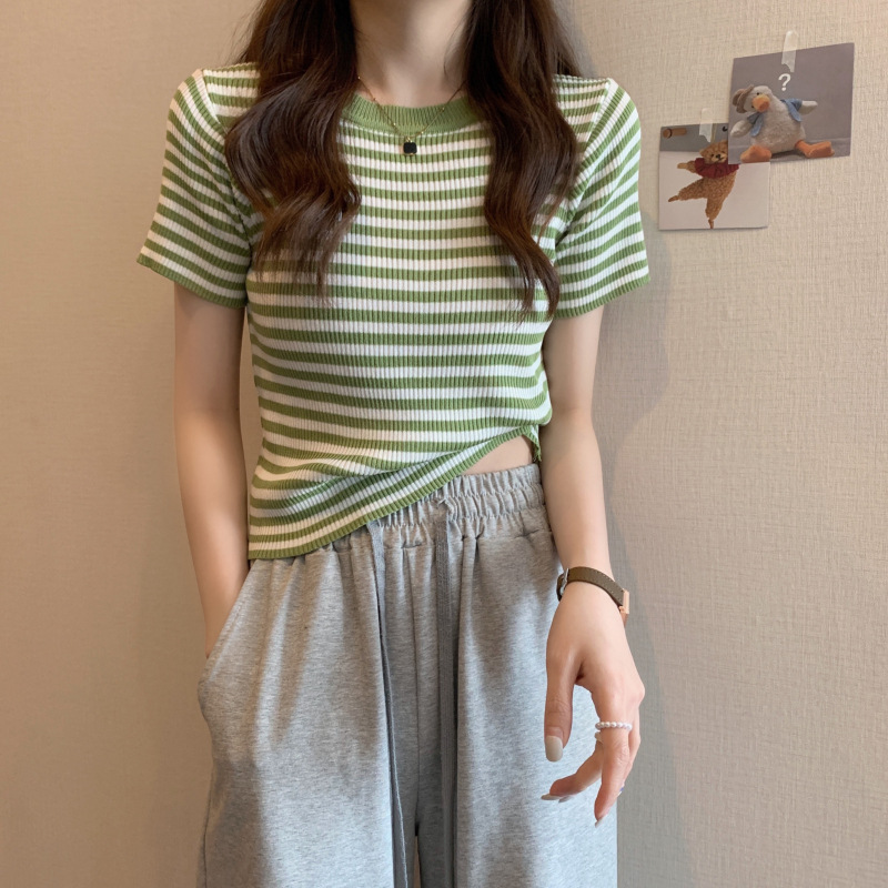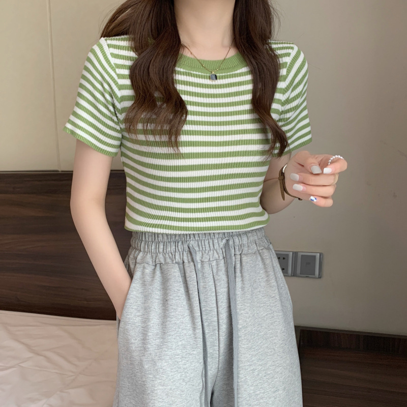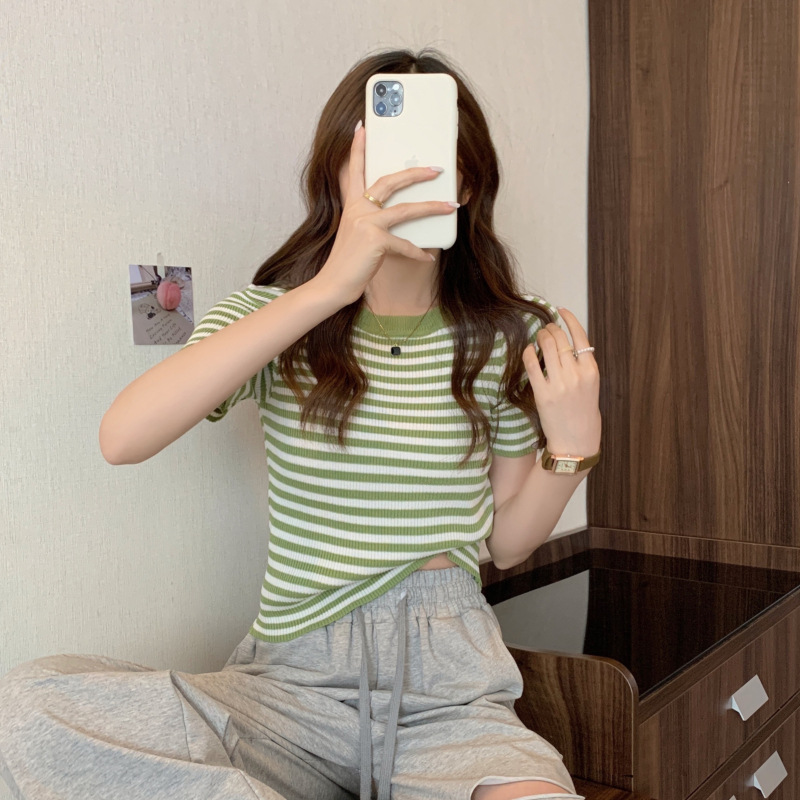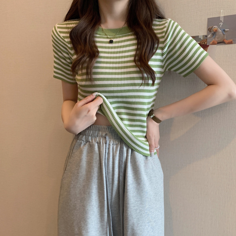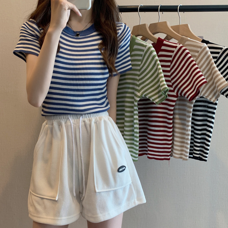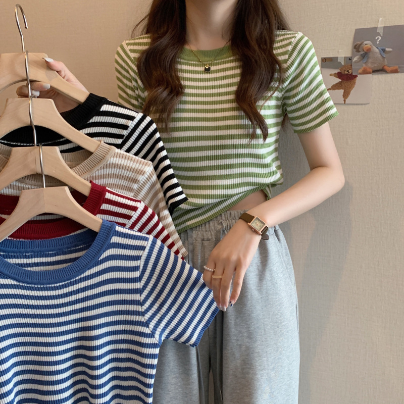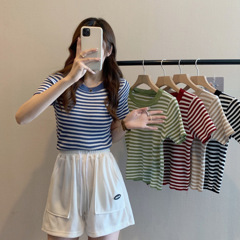 2023 새로운 반팔 스키니 베이스 스트라이프 니트웨어 아이스 실크 티셔츠 여성용 여름 슬림핏 탑 하이 웨이스트스토어 가기
