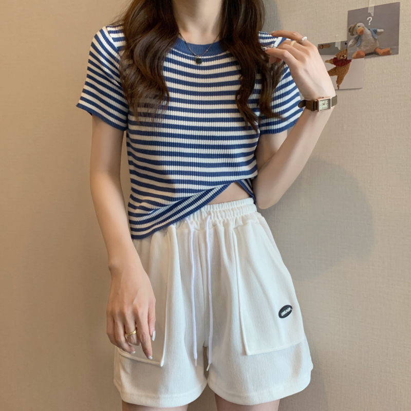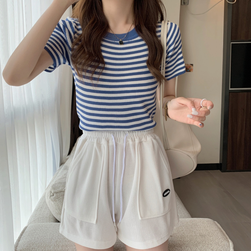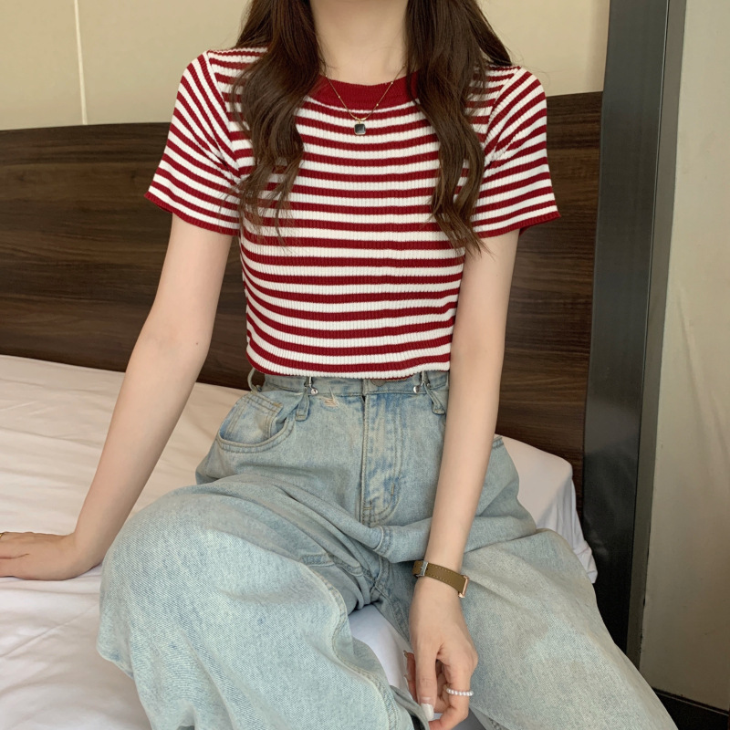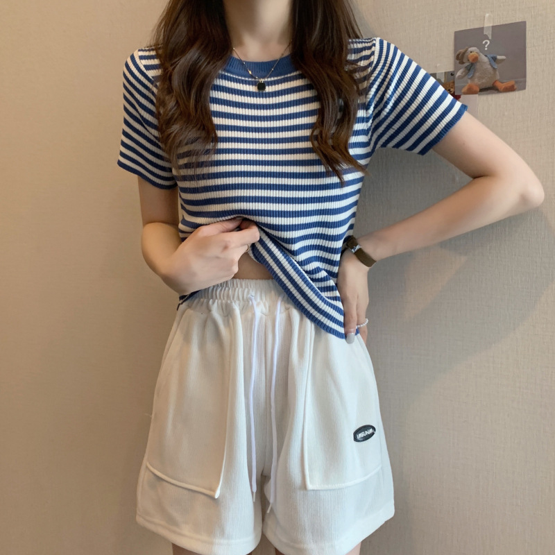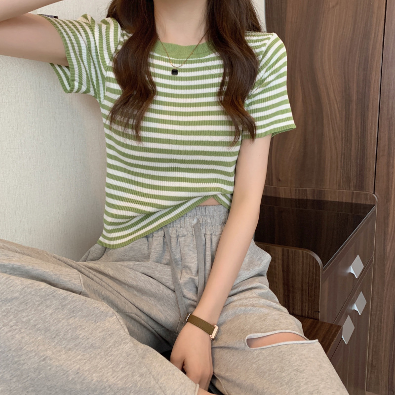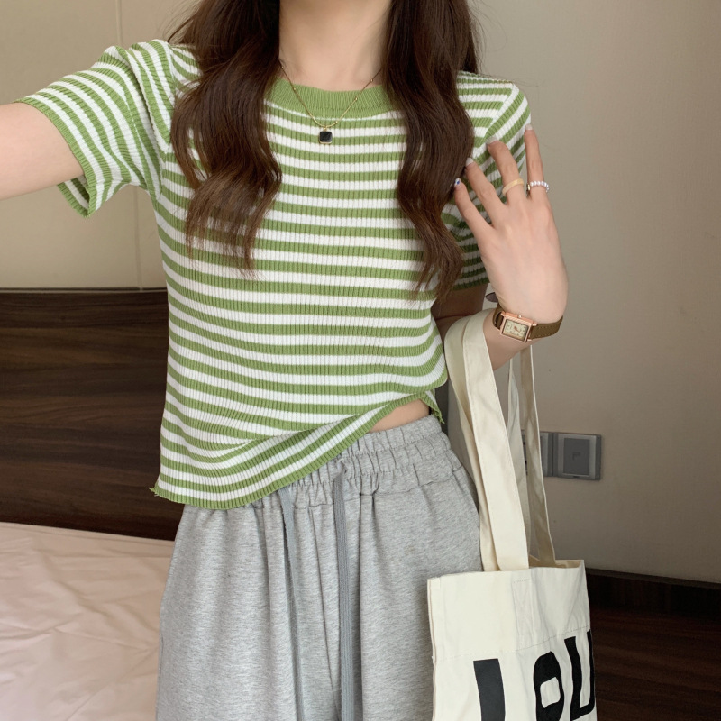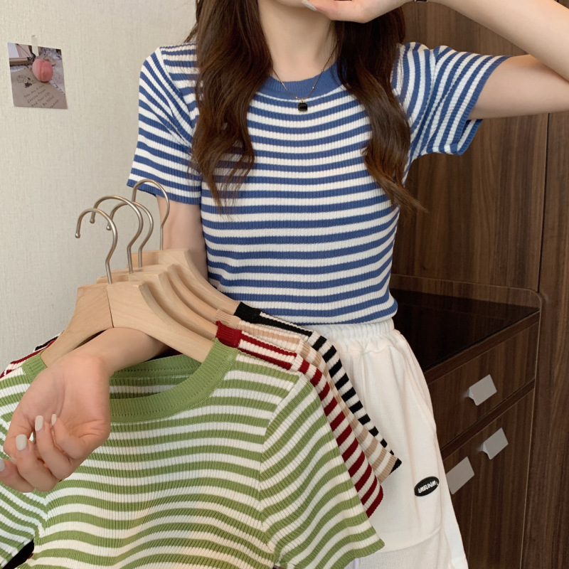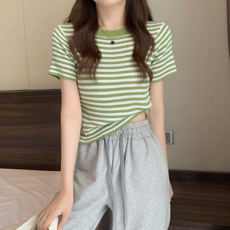 2023 새로운 반팔 스키니 베이스 스트라이프 니트웨어 아이스 실크 티셔츠 여성용 여름 슬림핏 탑 하이 웨이스트스토어 가기