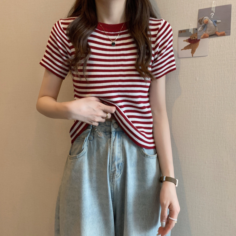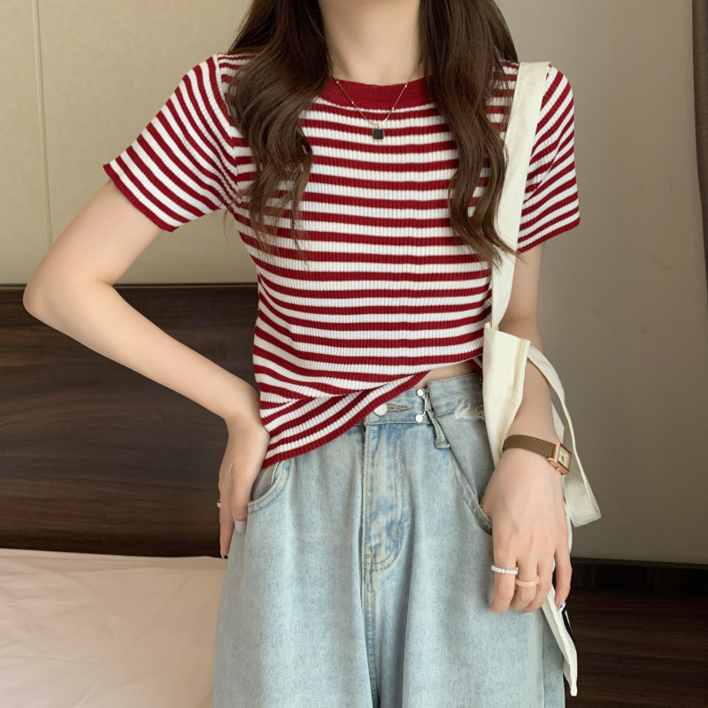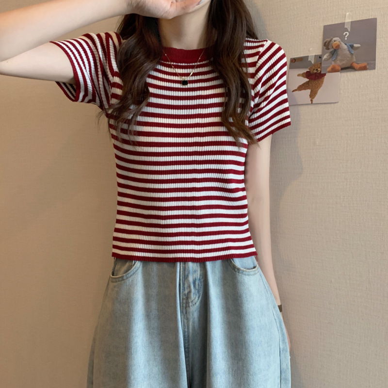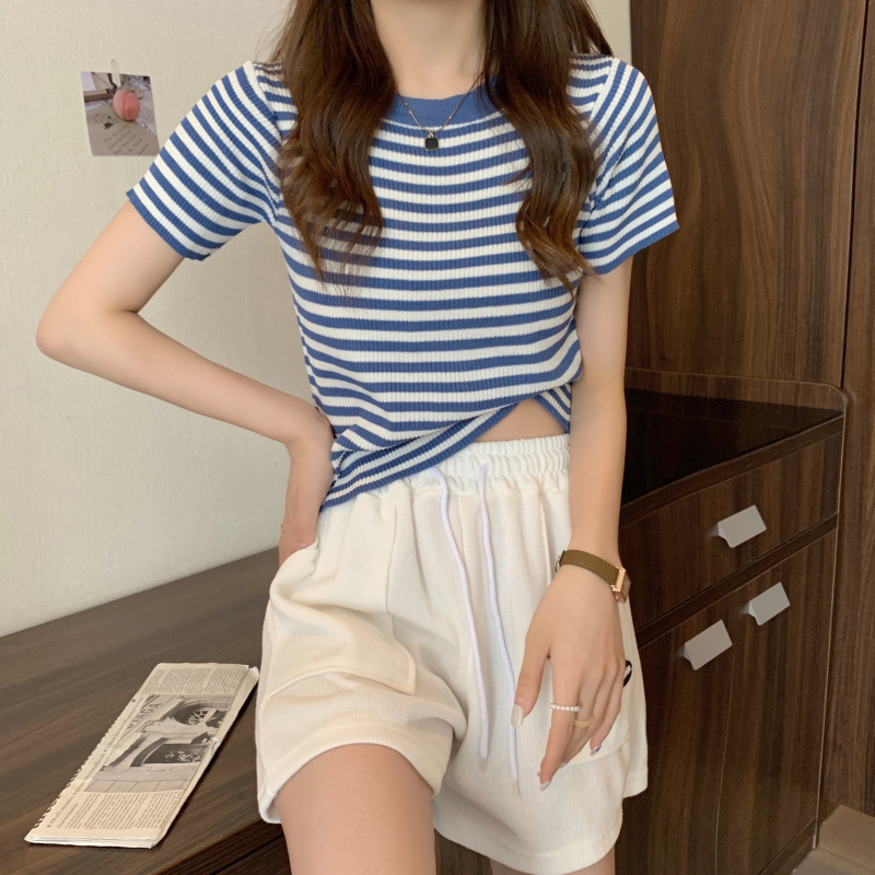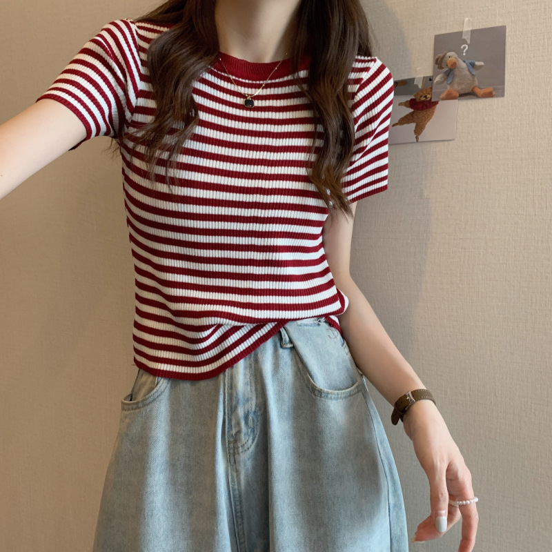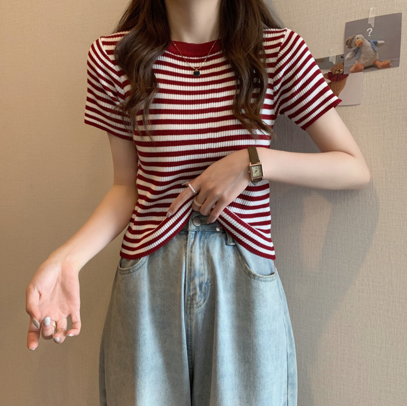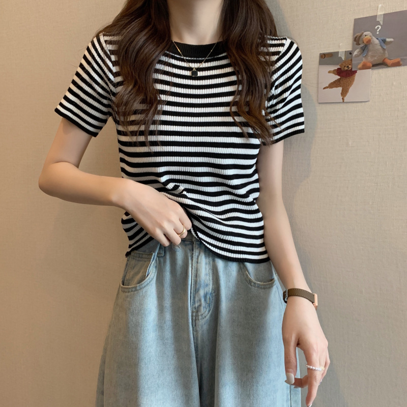 2023 새로운 반팔 스키니 베이스 스트라이프 니트웨어 아이스 실크 티셔츠 여성용 여름 슬림핏 탑 하이 웨이스트