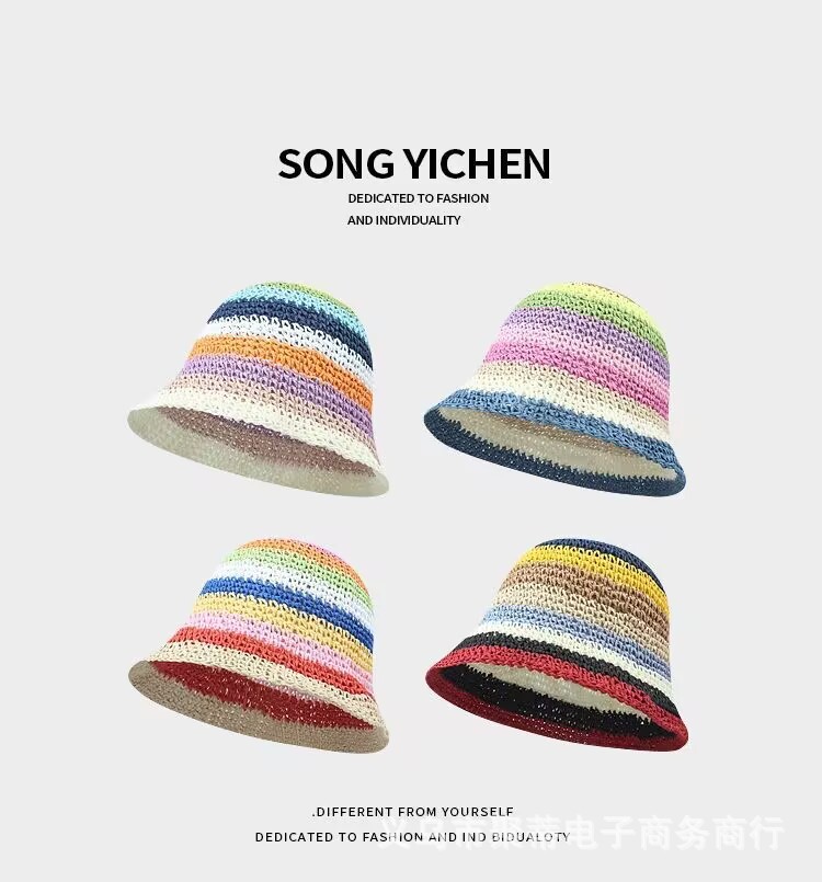 2023 봄과 여름 새로운 무지개 밀짚 모자 여성용 여름 여행 자외선 차단제 차양 모자 해변 어부 밀짚 모자 줄무늬 분지 모자