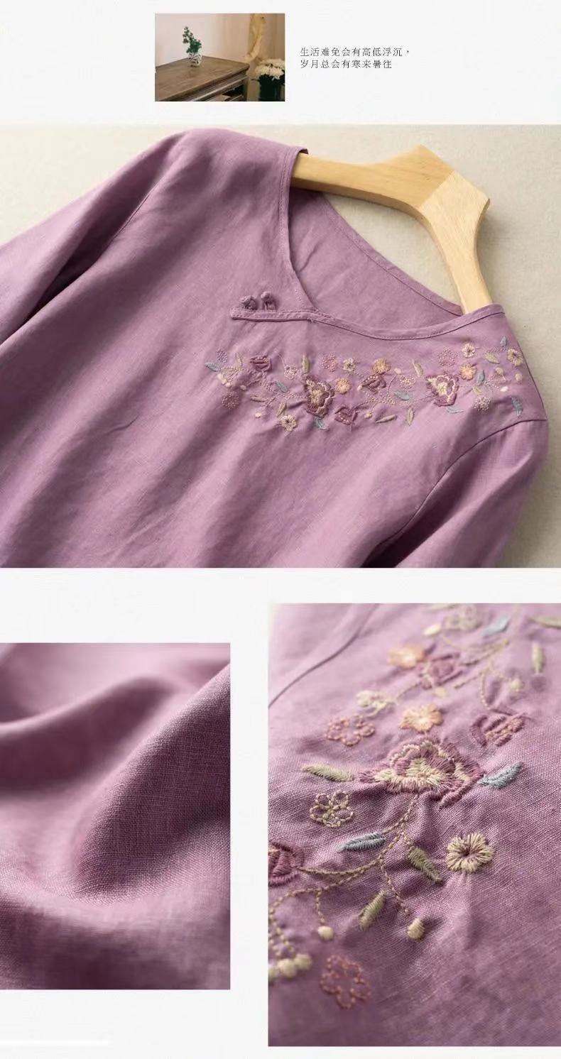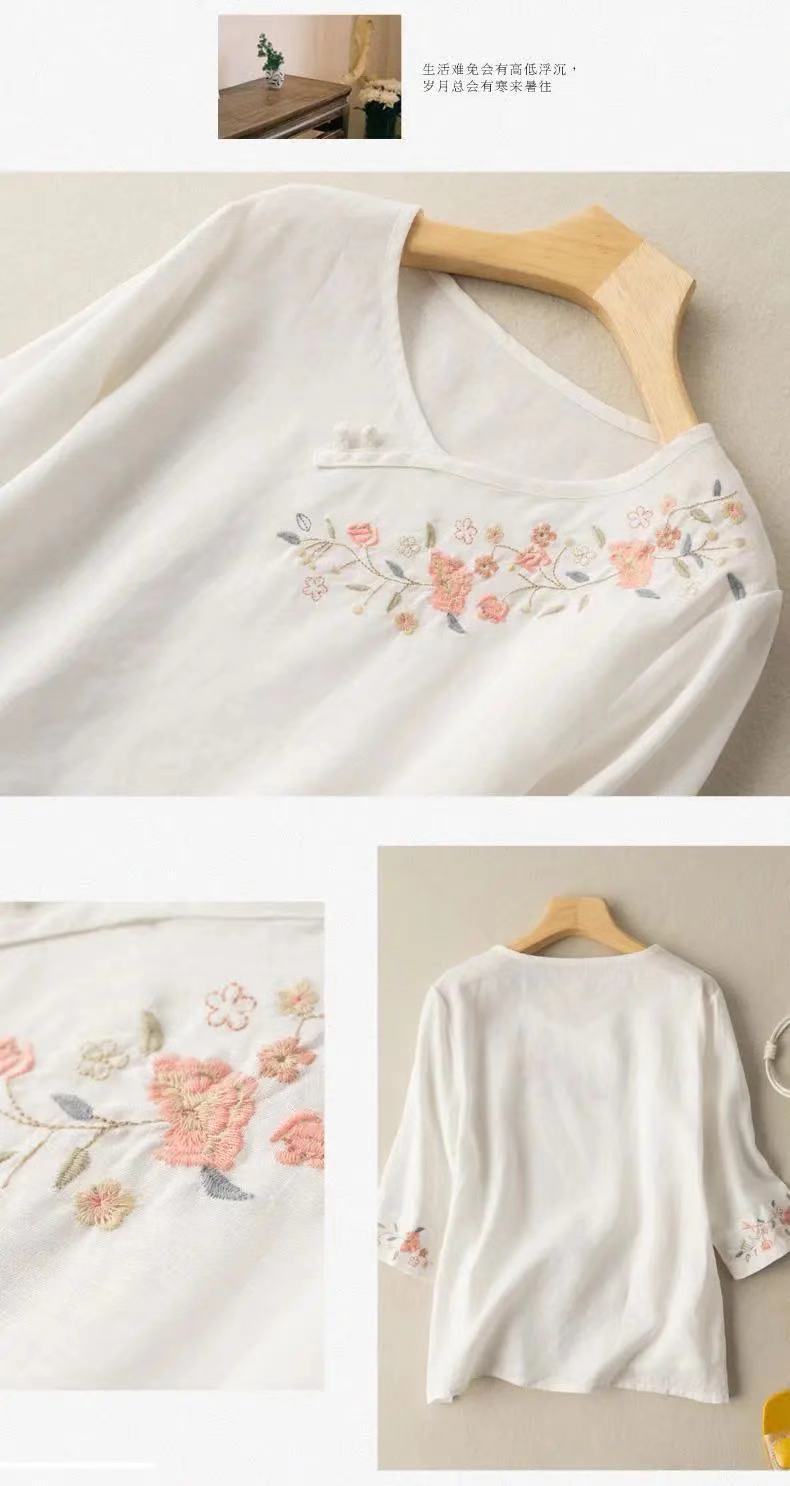 면과 린넨 티셔츠 여성용 여름 2022 신상품 루즈한 슬리밍 라운드 넥 자수 캐주얼 모든 매치 힙 슬리브 셔츠