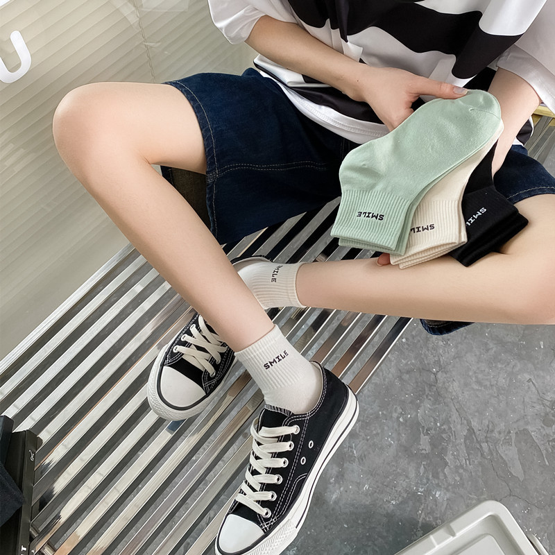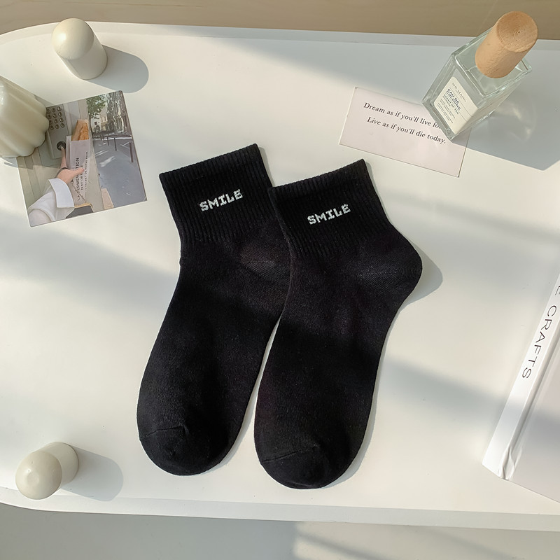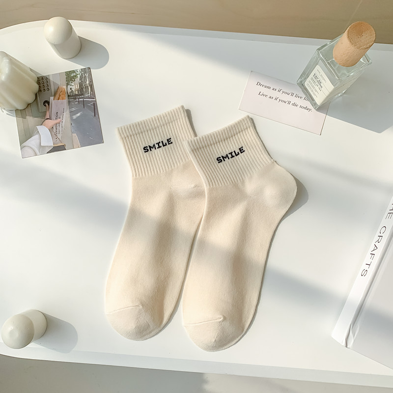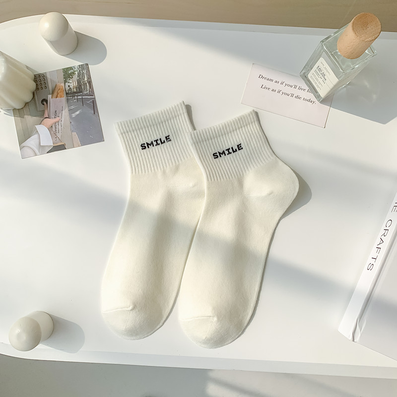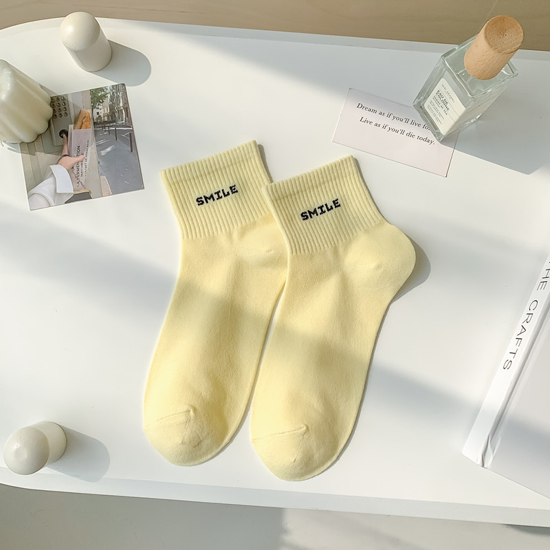 스마일 자수 여섯 가지 색상의 여성용 미디엄 양말, 흰색 신발과 함께 착용하는 코마사 면 여성용 심플 스포츠 숏삭스스토어 가기