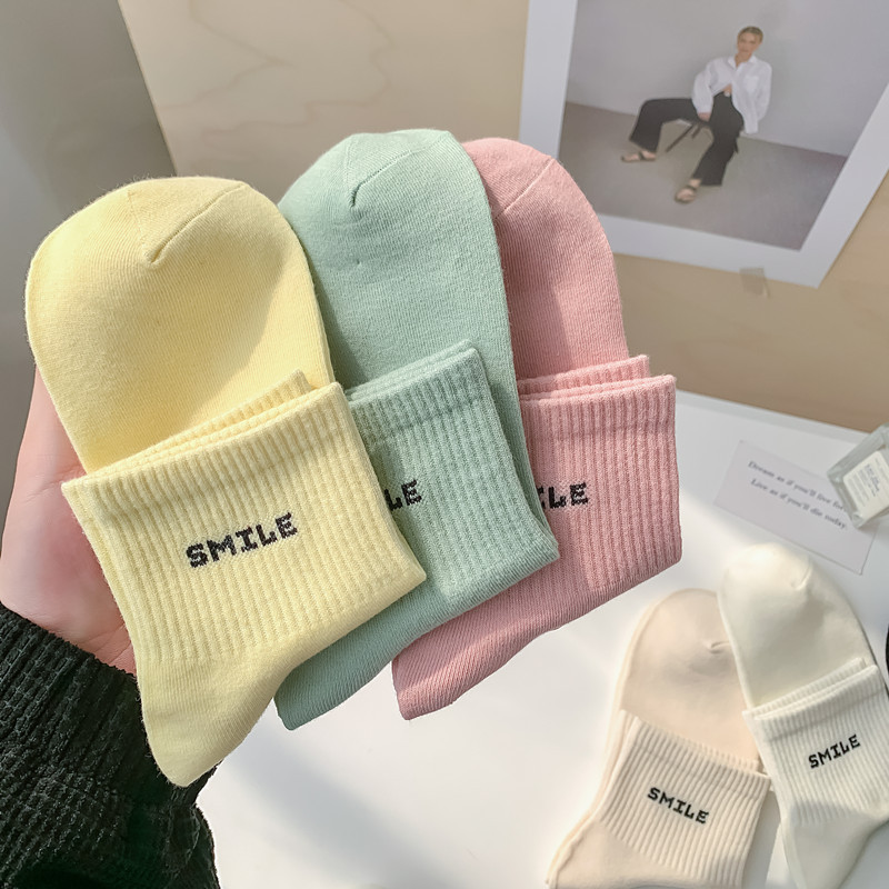 스마일 자수 여섯 가지 색상의 여성용 미디엄 양말, 흰색 신발과 함께 착용하는 코마사 면 여성용 심플 스포츠 숏삭스