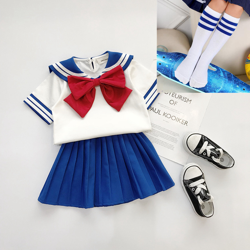 • 여자 반팔 면 세트 (재킷 + 치마) 빨간 더블 나비 넥타이 양말을 보내