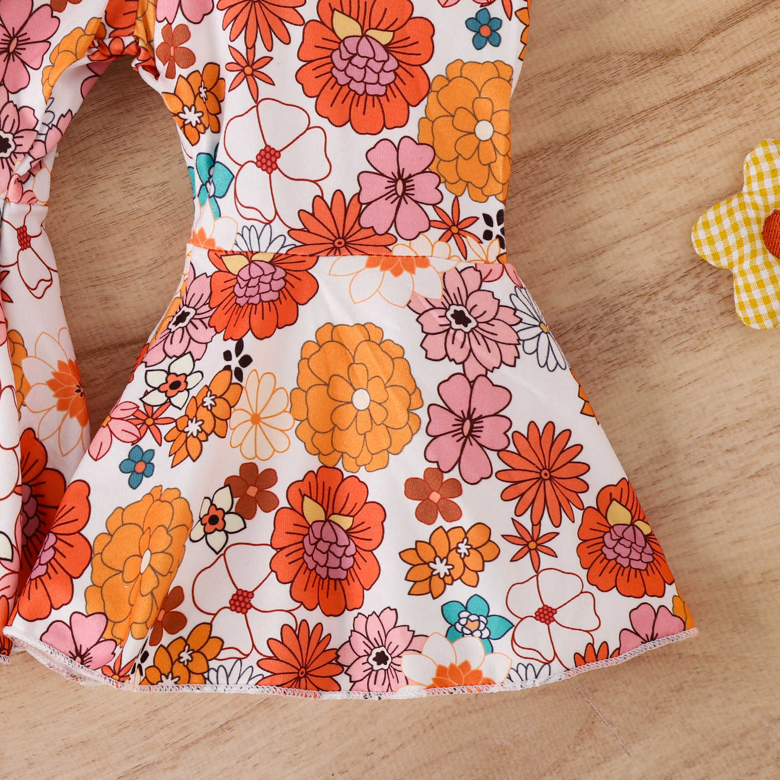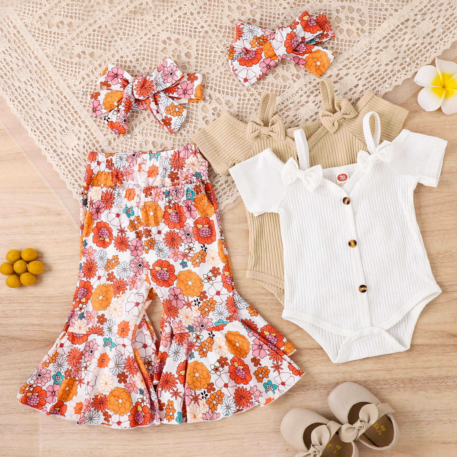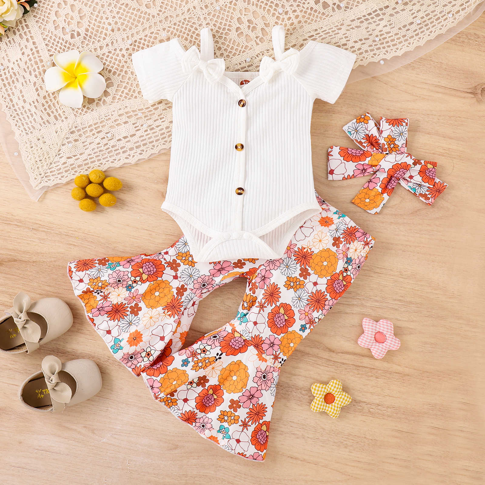Baopin 어린이 착용 유럽과 미국 여름 소녀 귀여운 활 V-목 짧은 소매 가방 뚱뚱한 옷 꽃 인쇄 플레어 바지 세트