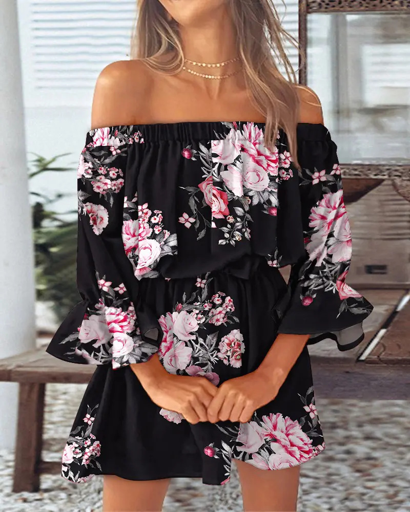 • 2025 欧美跨境亚马逊独立站性感时尚一字肩印花连衣裙女装 现货折扣价:26