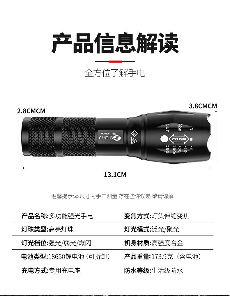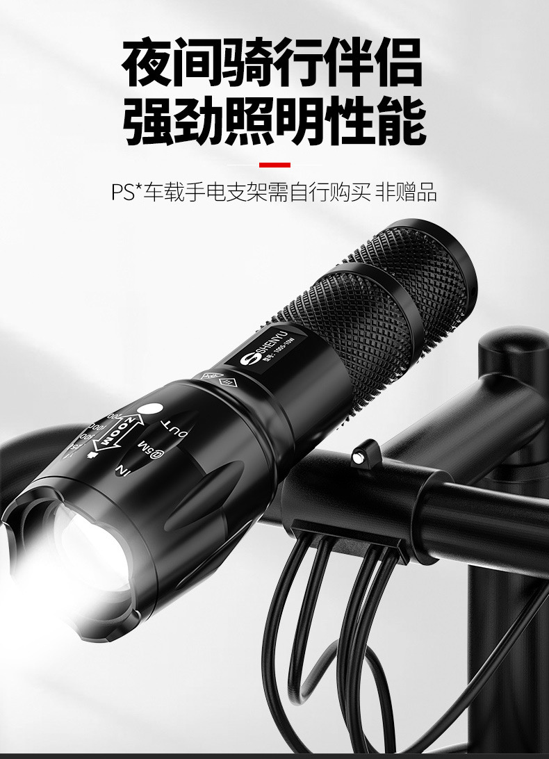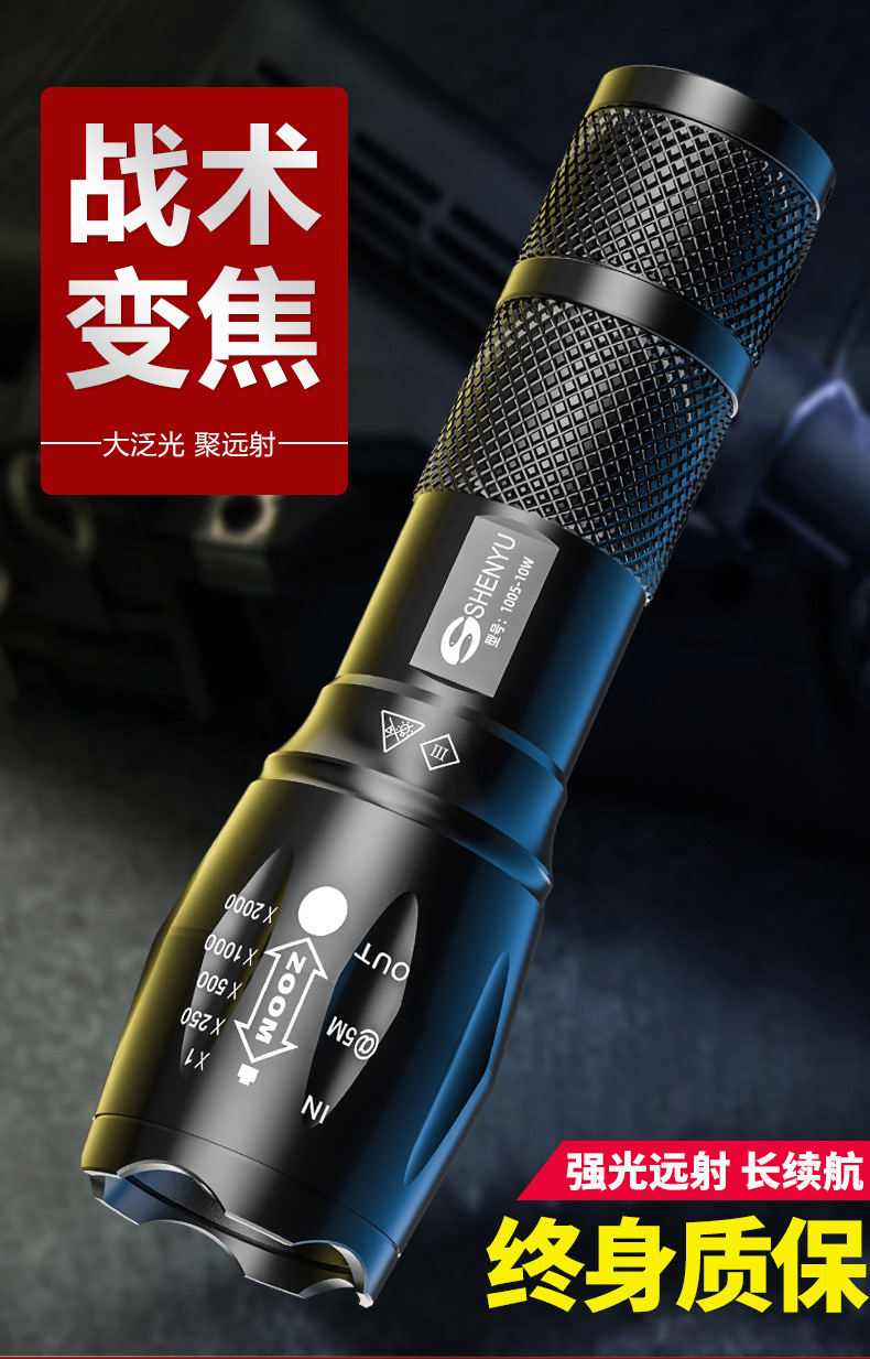 Shenyu/shenyu 강한 손전등 밝은 장거리 충전식 조정 가능한 초점 야외 가정용 방수 자기 방어 휴대용스토어 가기