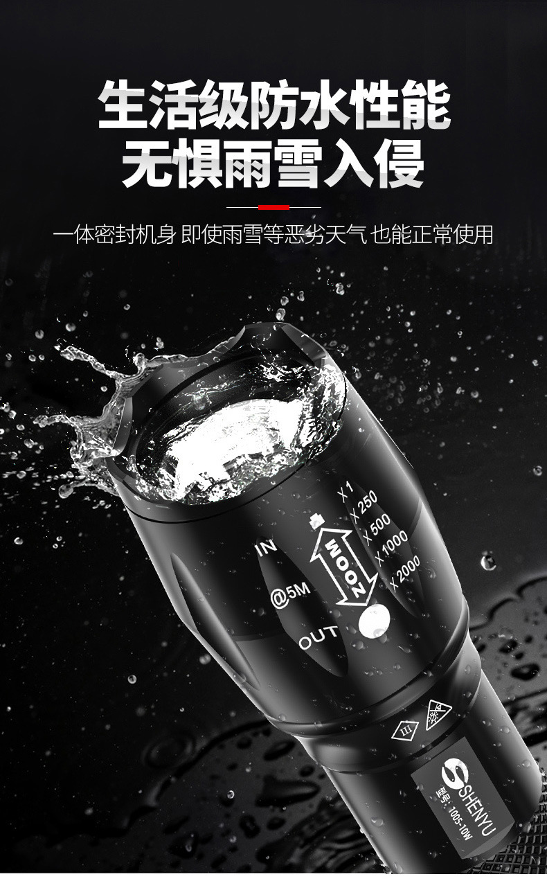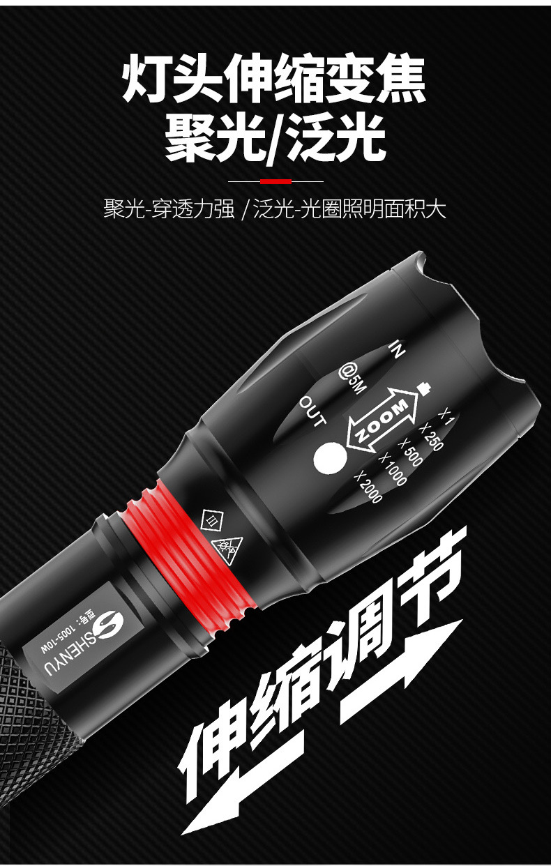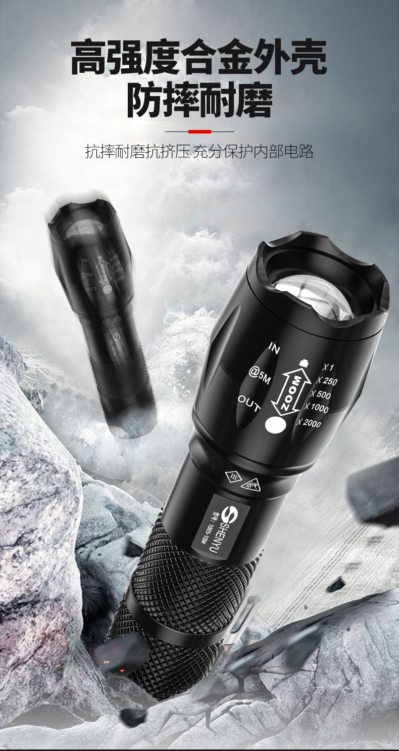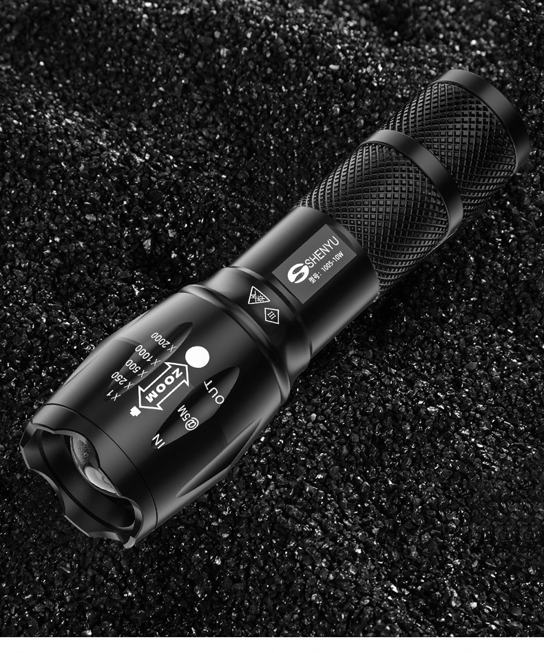 Shenyu/shenyu 강한 손전등 밝은 장거리 충전식 조정 가능한 초점 야외 가정용 방수 자기 방어 휴대용