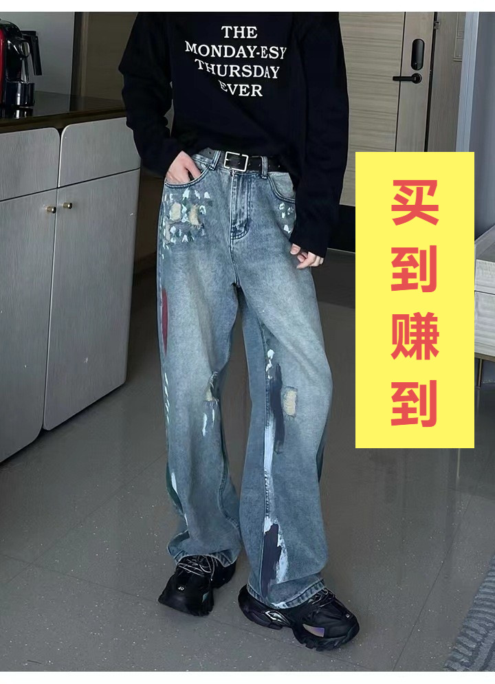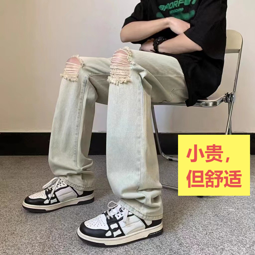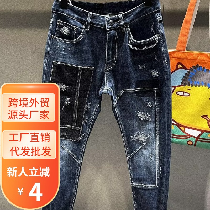 유러피언 스테이션 봄과 여름 트렌디 브랜드 하이 스트리트 찢어진 패치 라벨 청바지 남성용 트렌디 올매치 슬림 핏 발목 길이 팬츠스토어 가기