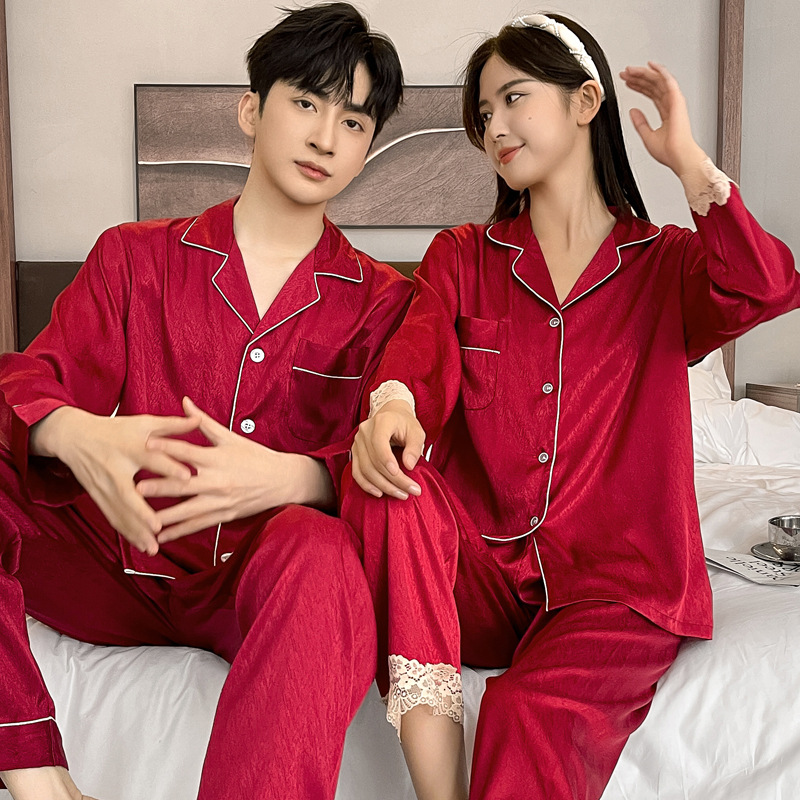 화이트 커플 잠옷 여성용 봄과 가을 아이스 실크 긴팔 고급 새로운 헤링본 패턴 남성용 실크 가정복