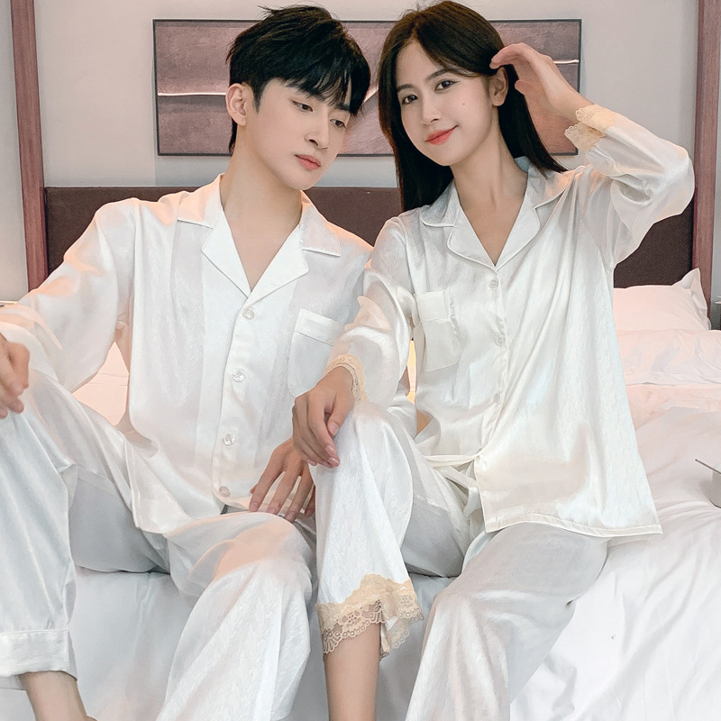화이트 커플 잠옷 여성용 봄과 가을 아이스 실크 긴팔 고급 새로운 헤링본 패턴 남성용 실크 가정복스토어 가기