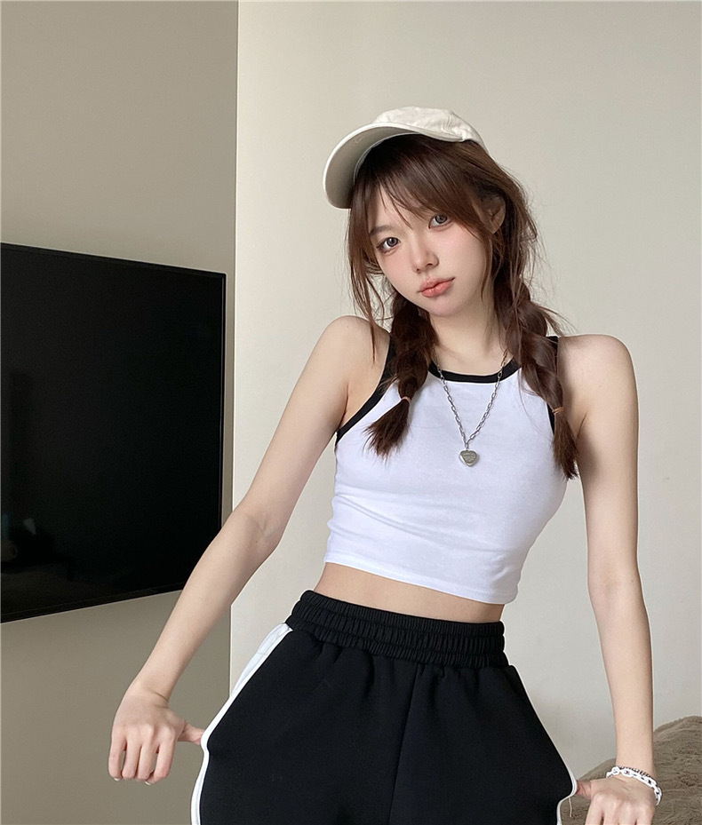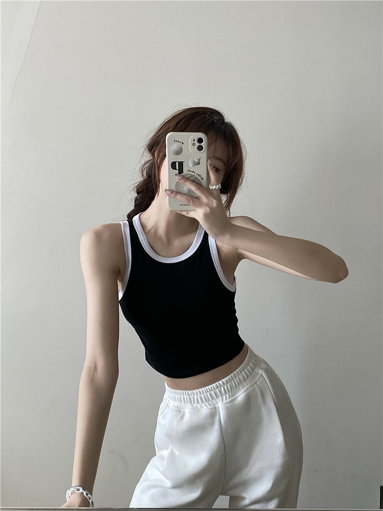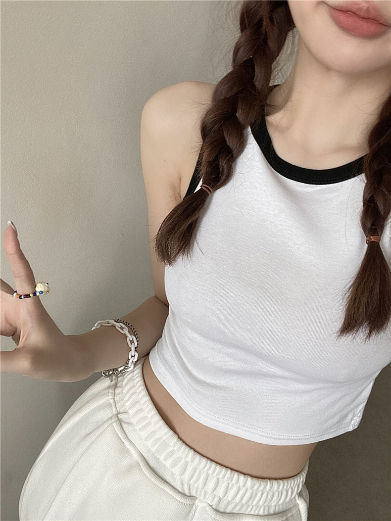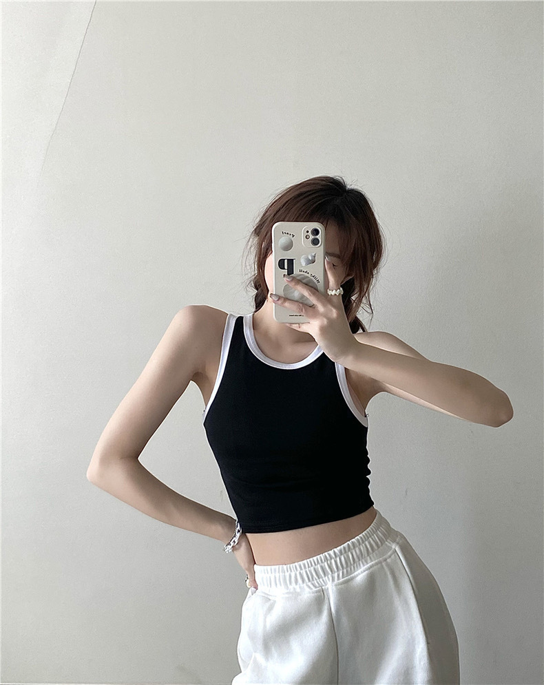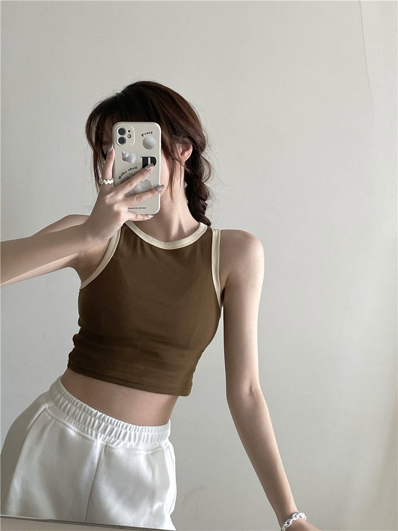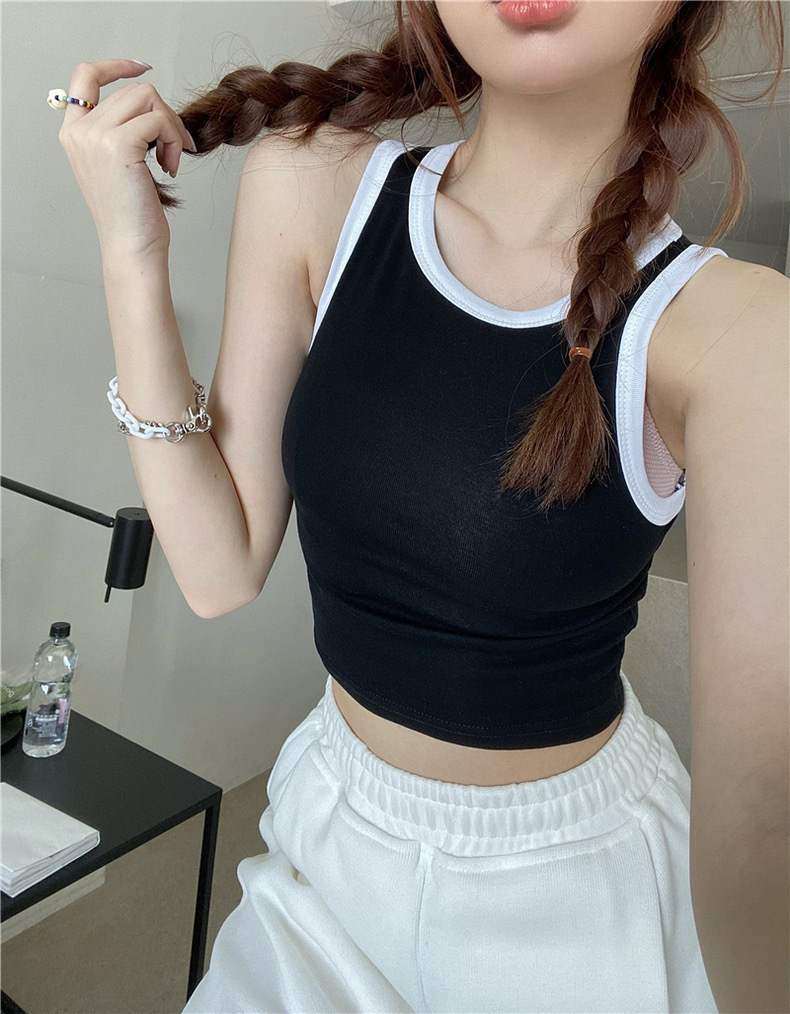 새로운 한국 스타일 대비 색상 원피스 아름다운 등 여성용 레트로 스파이스 걸 고정 컵 겉옷 여성용 가슴 패드가있는 모든 매치 I 자형 조끼스토어 가기