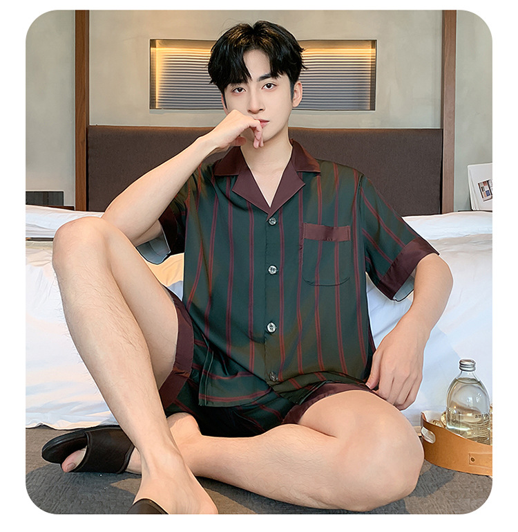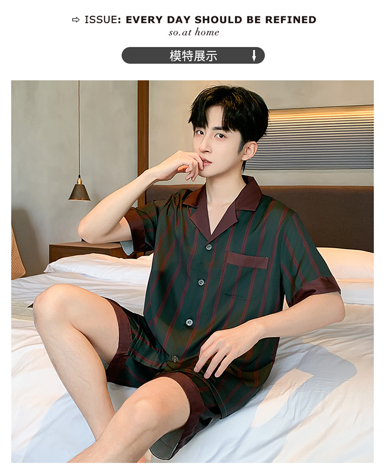 새로운 도착 얼음 실크 잠옷 남자 얇은 반팔 옷깃 여름 십대 플러스 사이즈 105kg 착용 가능한 홈웨어 세트스토어 가기